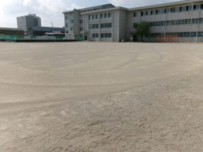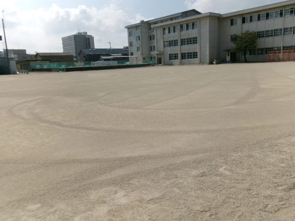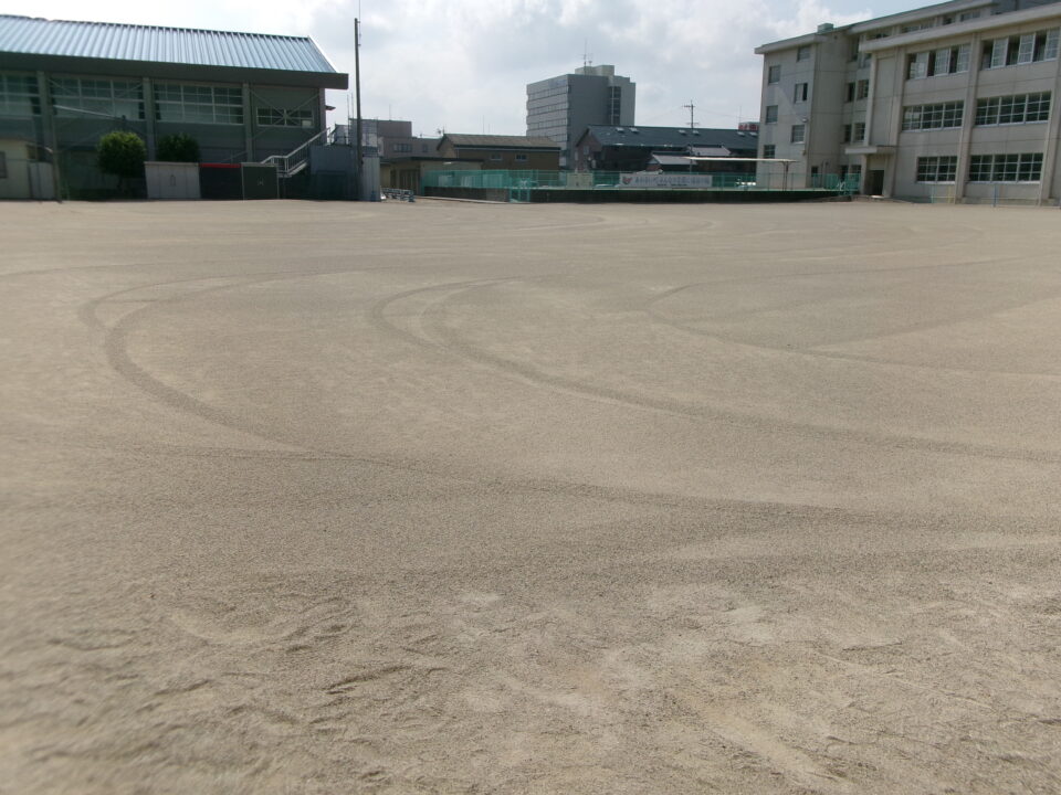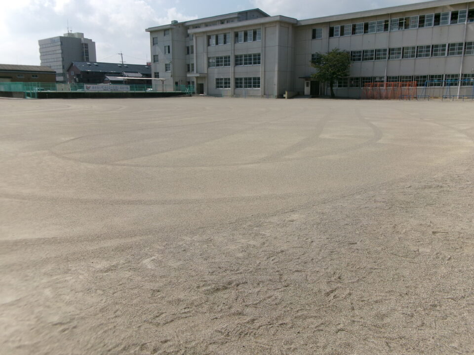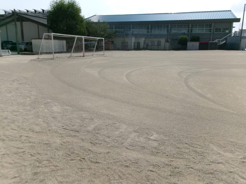 夏休み最後の週に台風10号の影響で大雨が続き、運動場が海のようになり高いところから低いところへ水が流れ、地面が水にえぐられ、でこぼこになっていました。