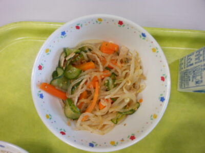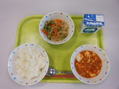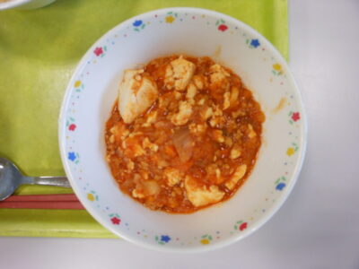 今日の給食は、ご飯、牛乳、豆腐とえびのチリソース煮、バンサンスーでした。
