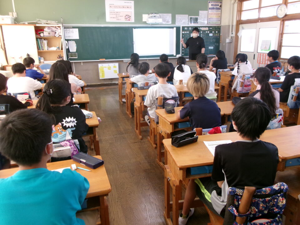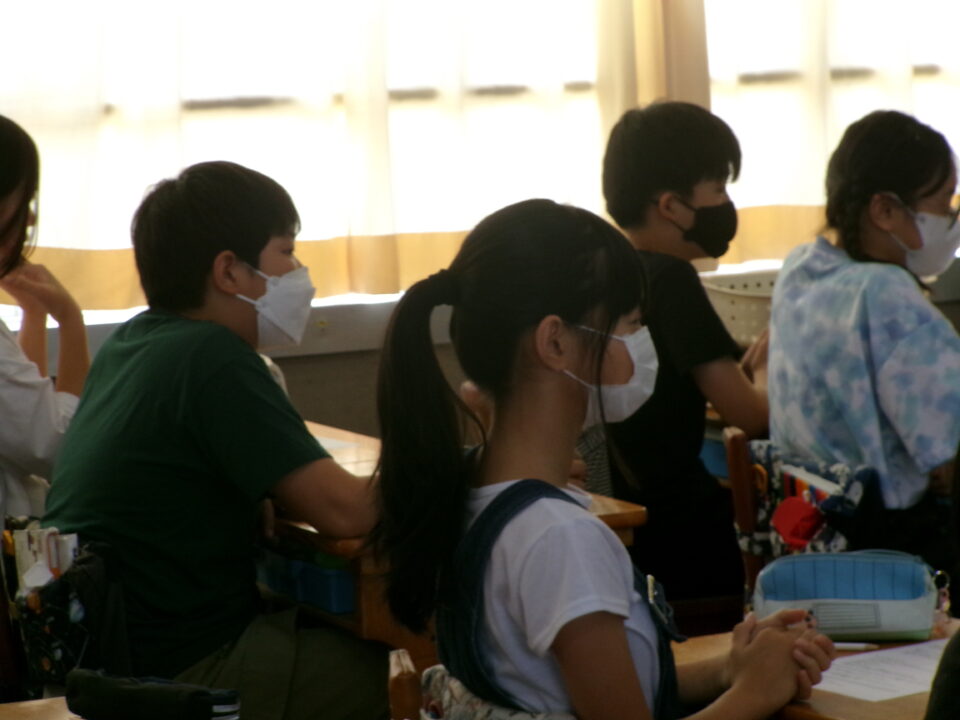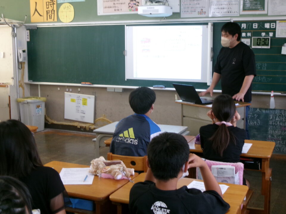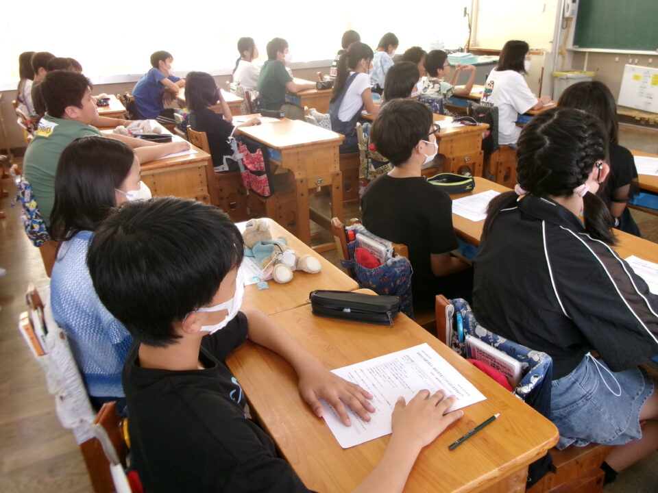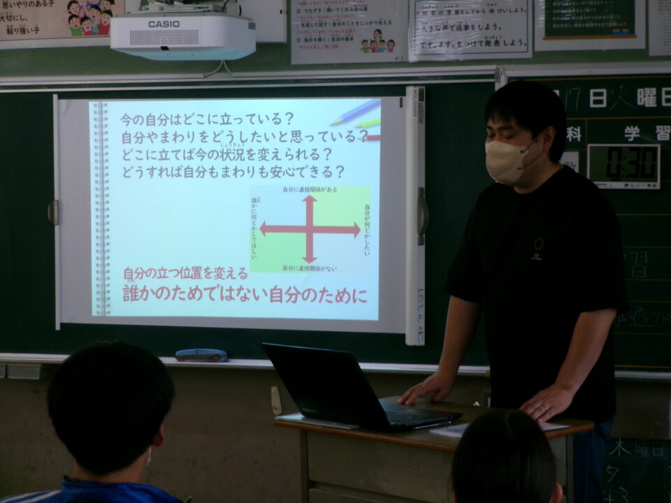6年生では、反差別・人権研究所みえ(ヒューリアみえ)から講師の方を招いて、『自分の立つ位置を変える~自分と向き合うことからはじめませんか?』という題でお話をしていただきました。