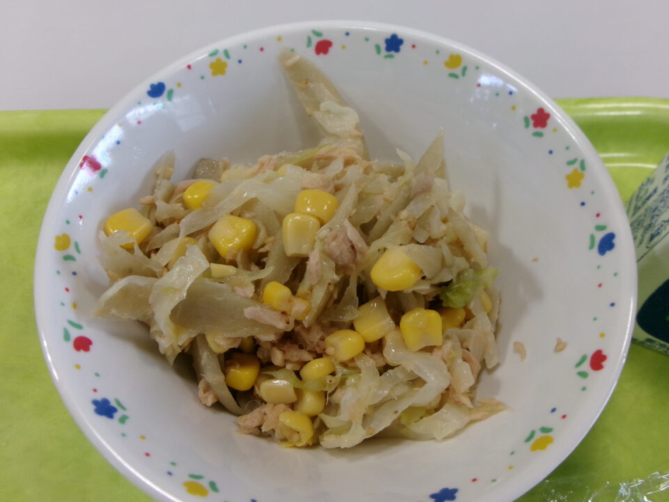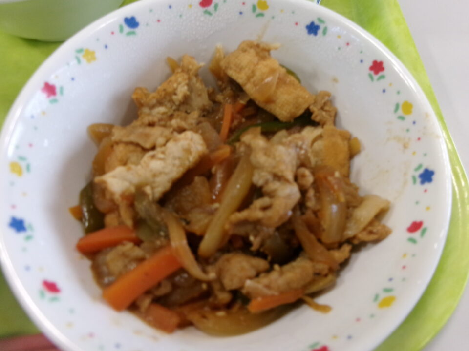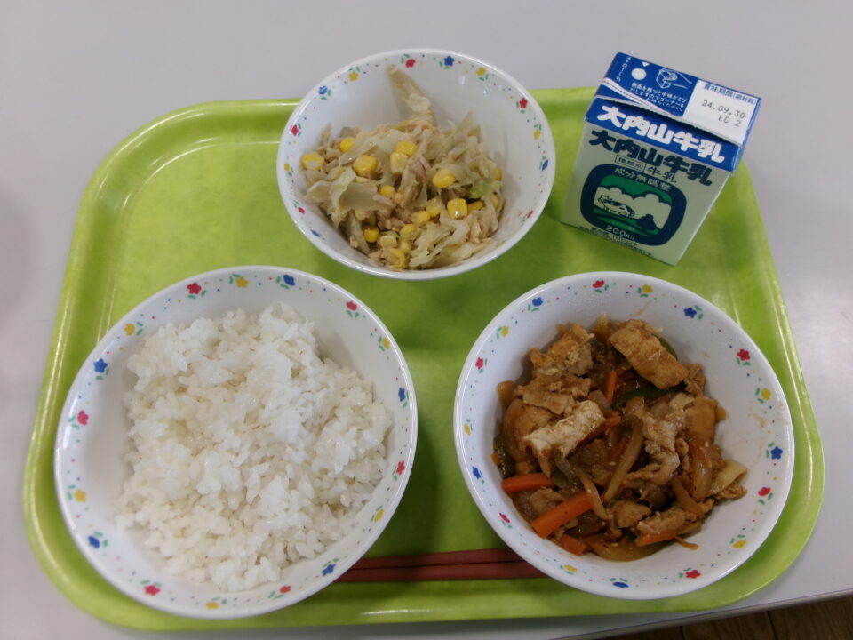 今日の給食は、ご飯(麦入り)、牛乳、厚揚げと豚肉のピリ辛炒め、ごぼうの和風サラダでした。