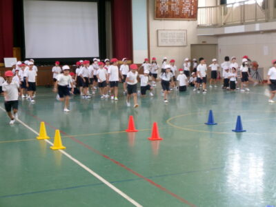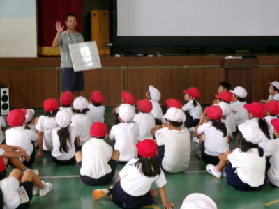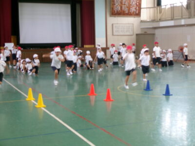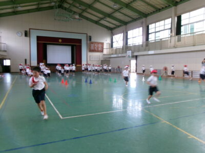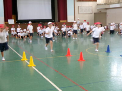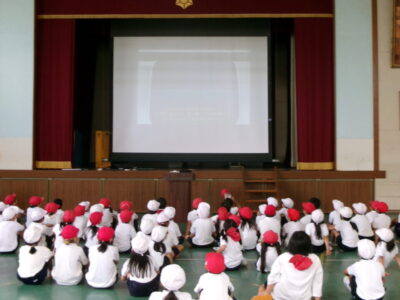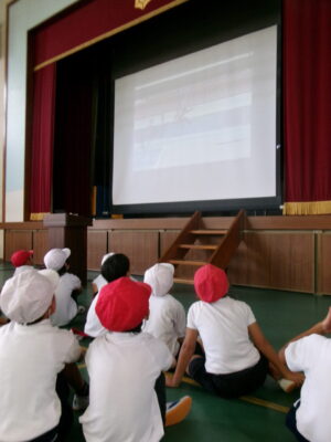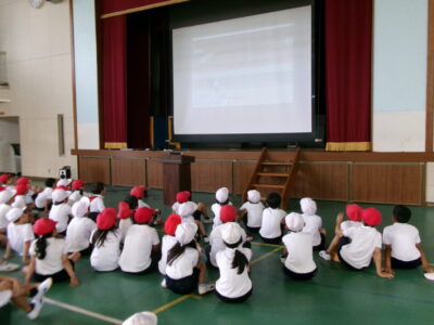 3年生は、体育館で『走り幅跳びをするときのコツ』を動画を見て学習しました。