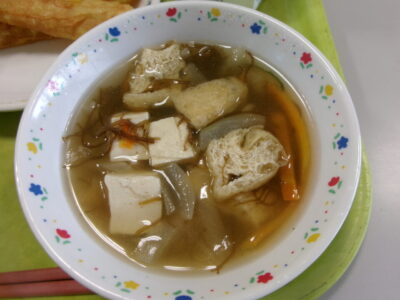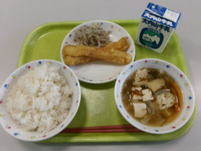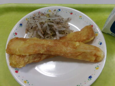今日の給食は、ご飯(麦入り)、牛乳、ちくわのしょうが入りてんぷら、もやしのしそ和え、もずく入りすまし汁でした。