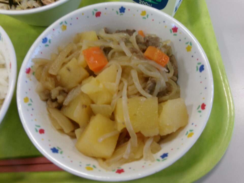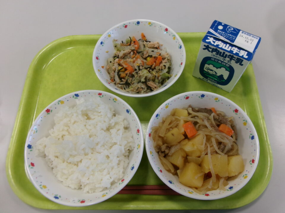 今日の給食は、ご飯、牛乳、肉じゃが、ひじきサラダでした。