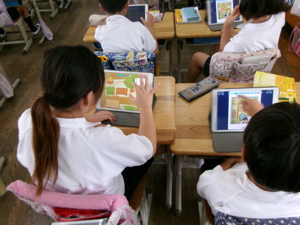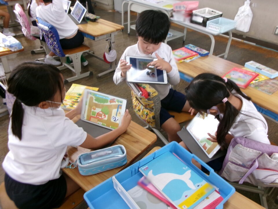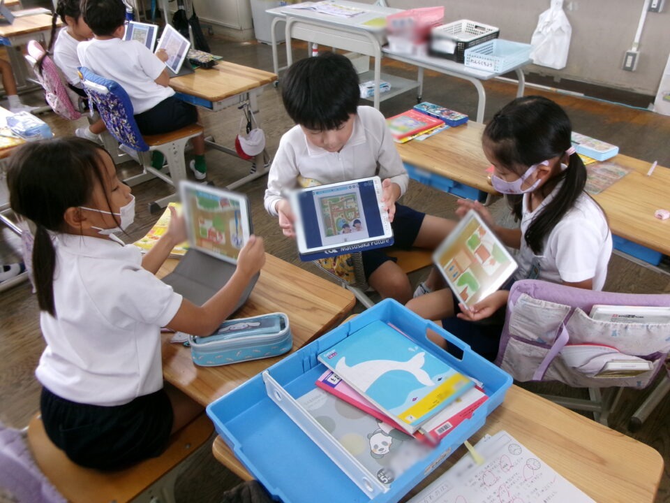 2年生では、タブレットを上手に活用していました。かまあいトークで自分の考えを見せ合って話しています。