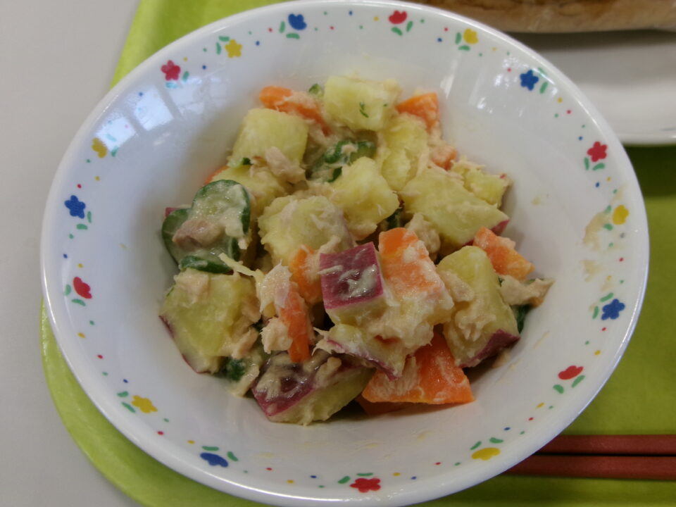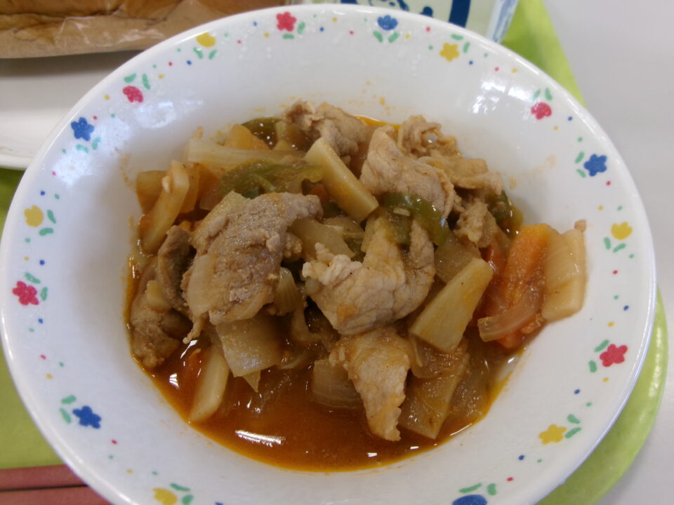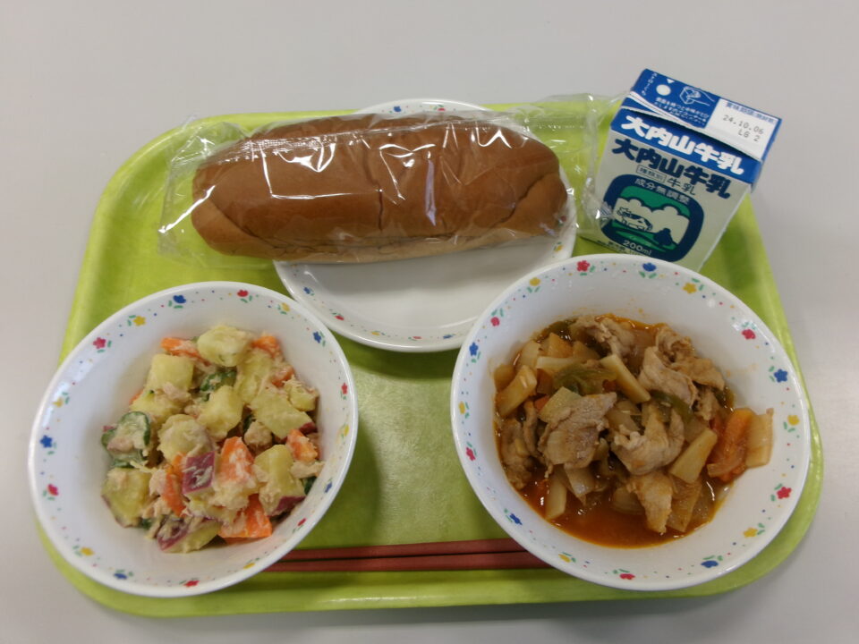 今日の給食は、黒糖パン、牛乳、豚肉と野菜のバーベキューソース炒め、おさつサラダでした。