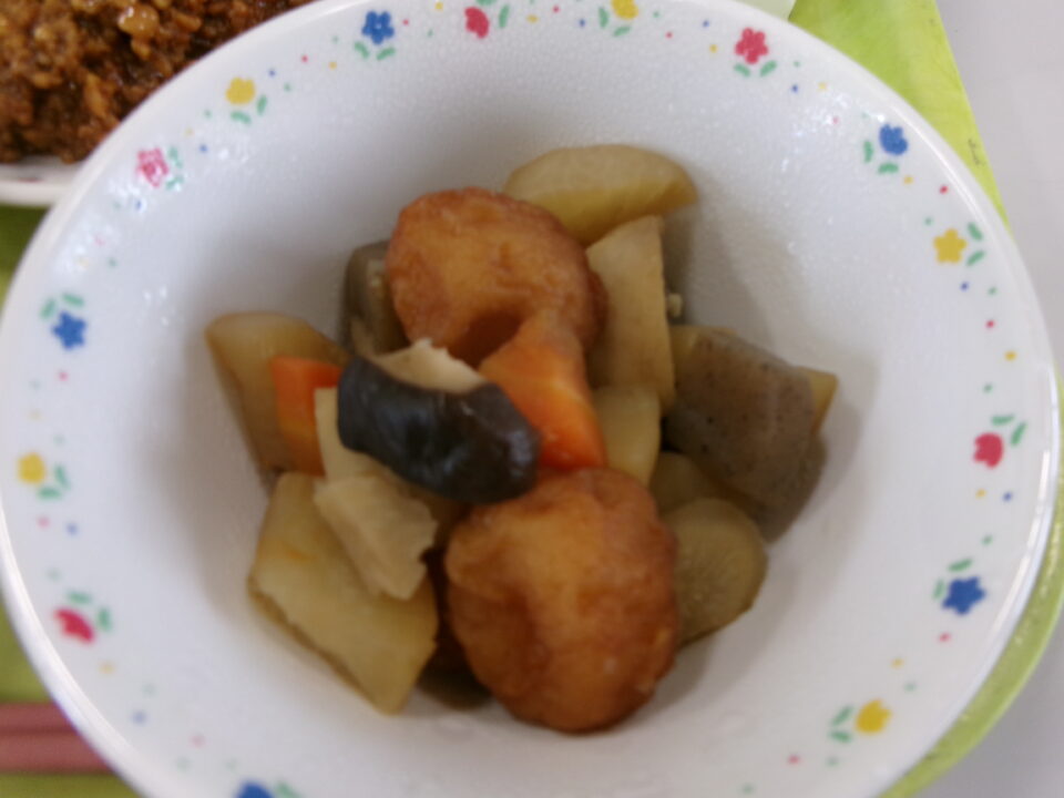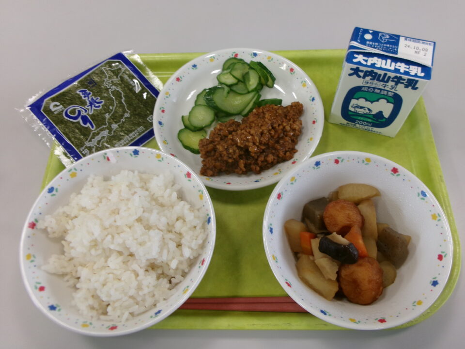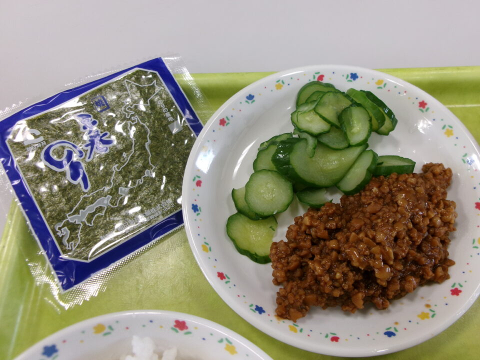 ご飯(麦入り)、納豆みそ、きゅうり、手巻きのり、牛乳、飯高産生しいたけと根菜の煮物でした。