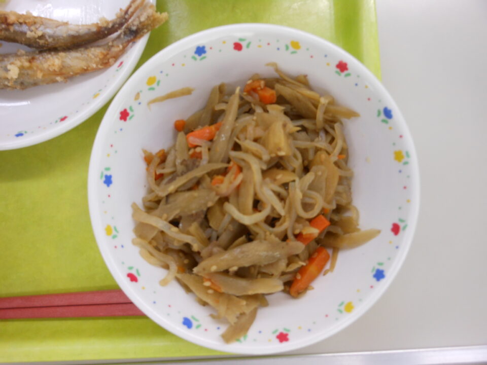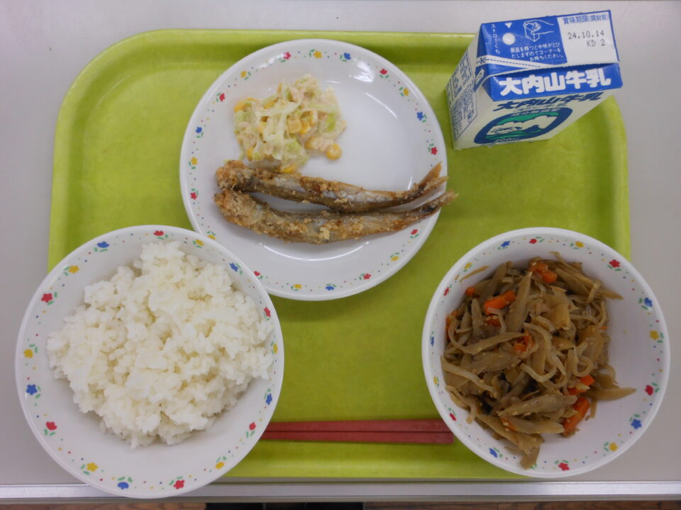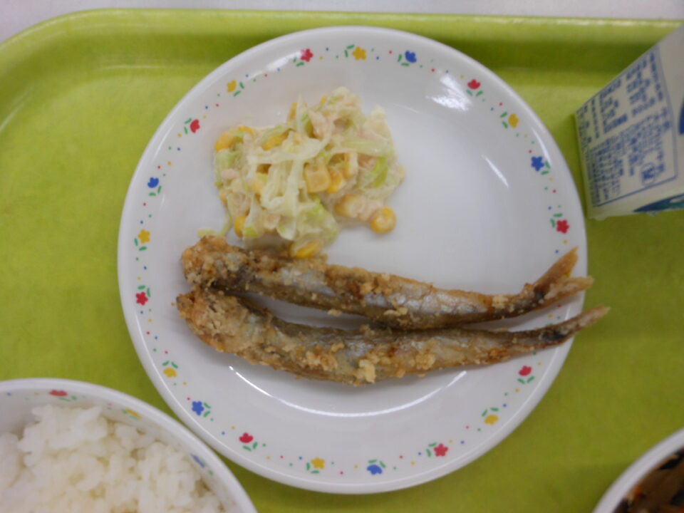 今日の給食は、ご飯、牛乳、ししゃものから揚げ、鶏肉と野菜のマヨネーズ和え、まこも入りきんぴらでした。