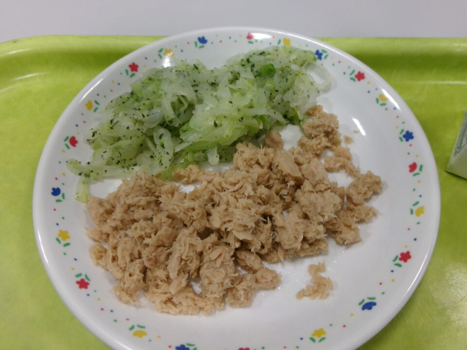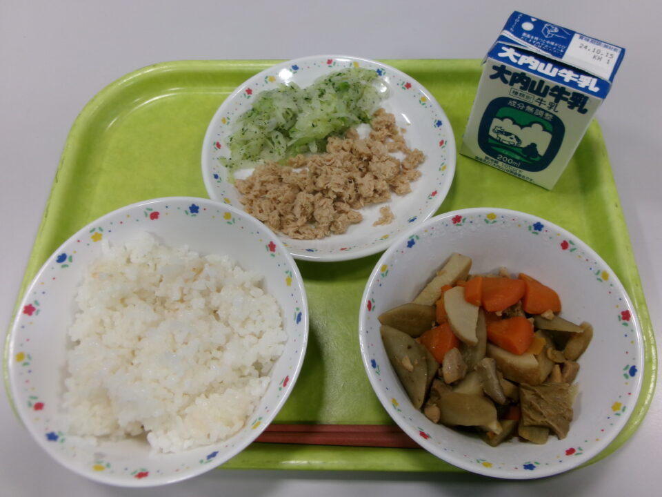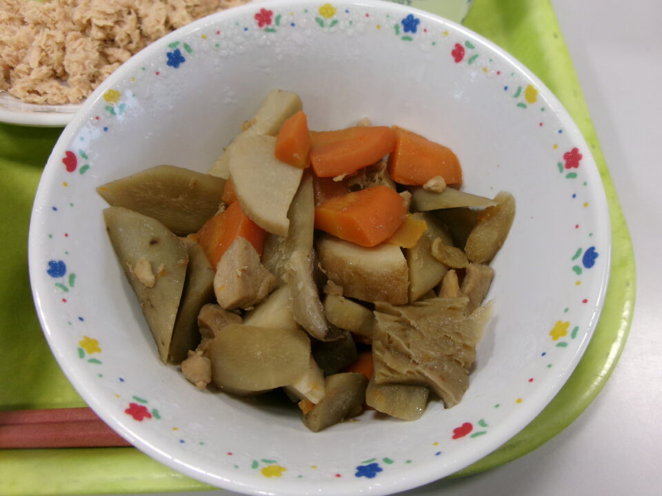 今日きょう給食きゅうしょくは、ごはん牛乳ぎゅうにゅう、ツナそぼろ、キャベツのあおじそえ、筑前煮ちくぜんにでした。