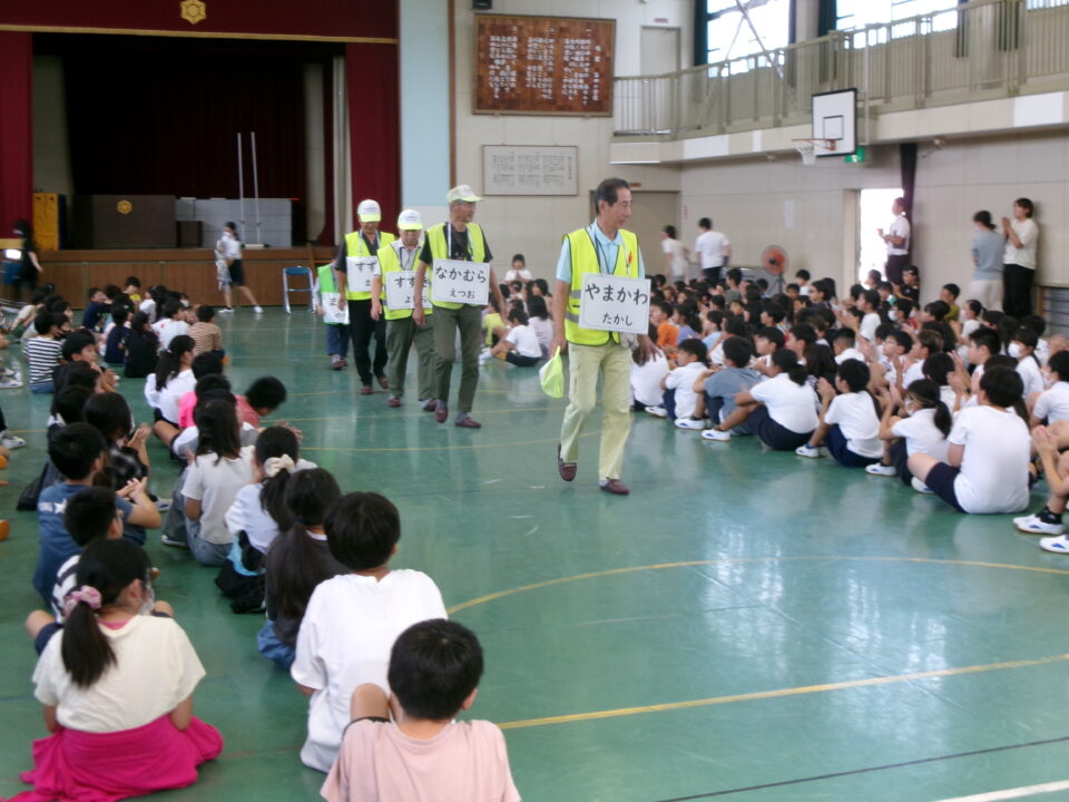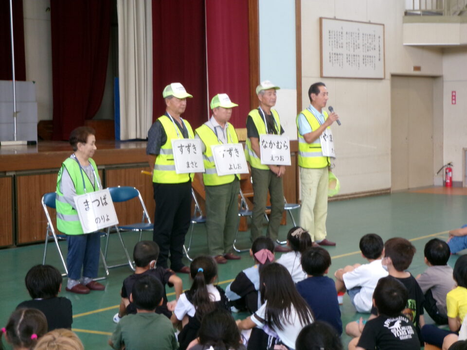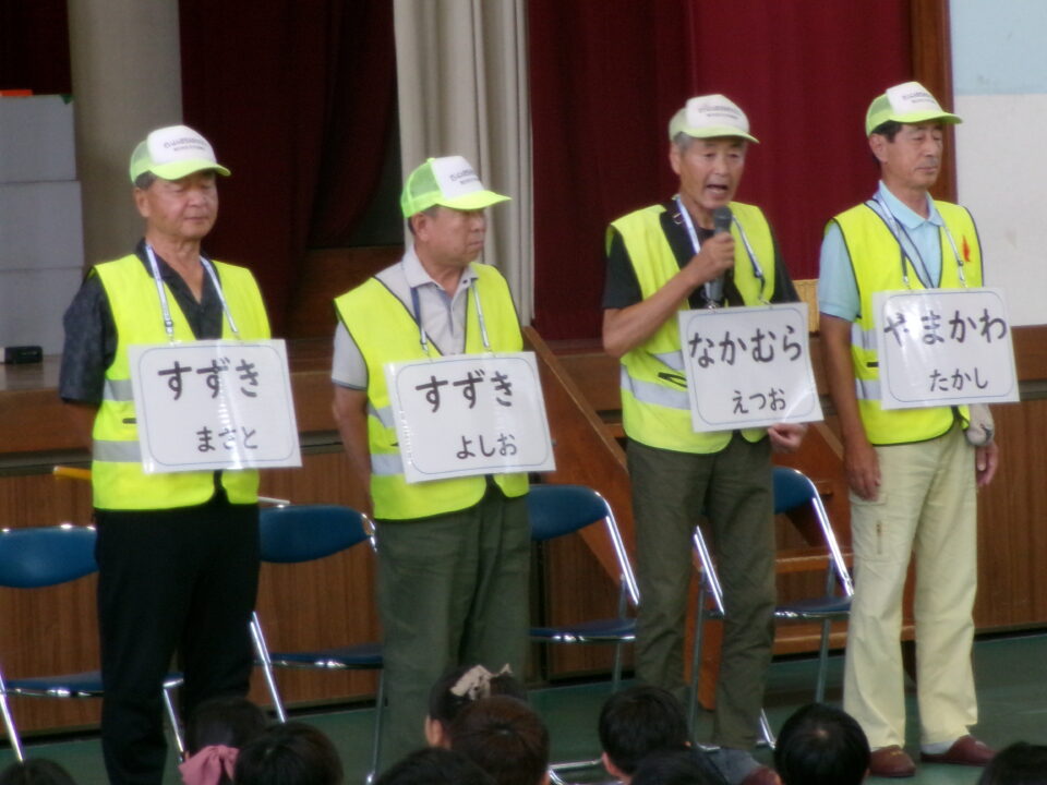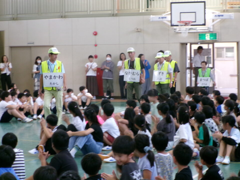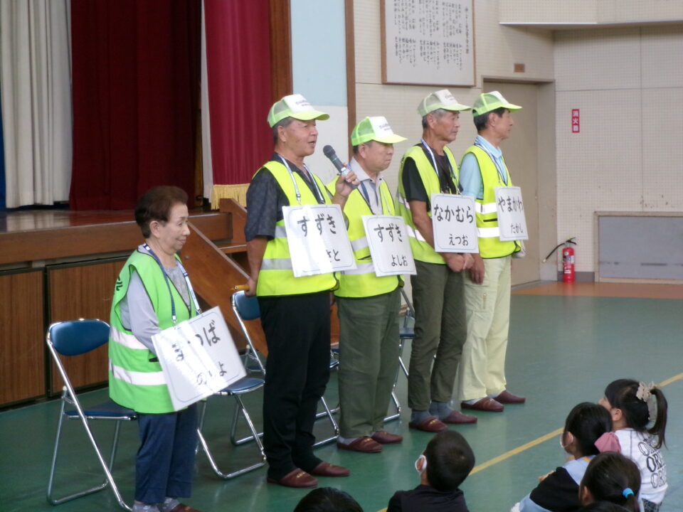 5限目のにっこり集会では、最初に、地域の方とのふれあいコーナーを行いました。いつも登下校を見守ってくださっている地域の方に来ていただき、みんなへメッセージをいただきました。