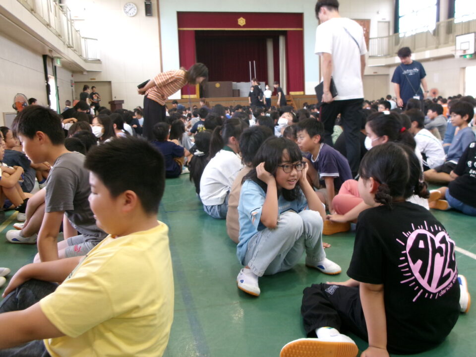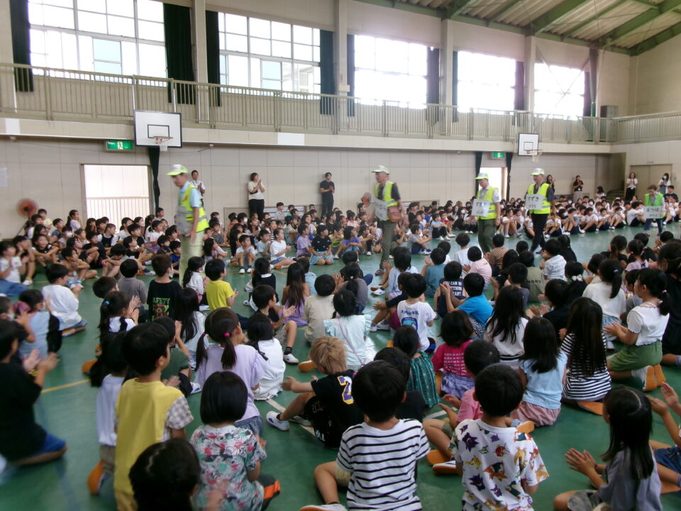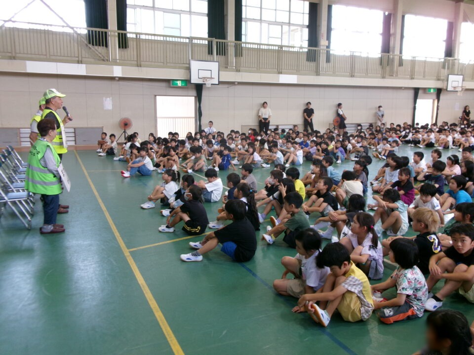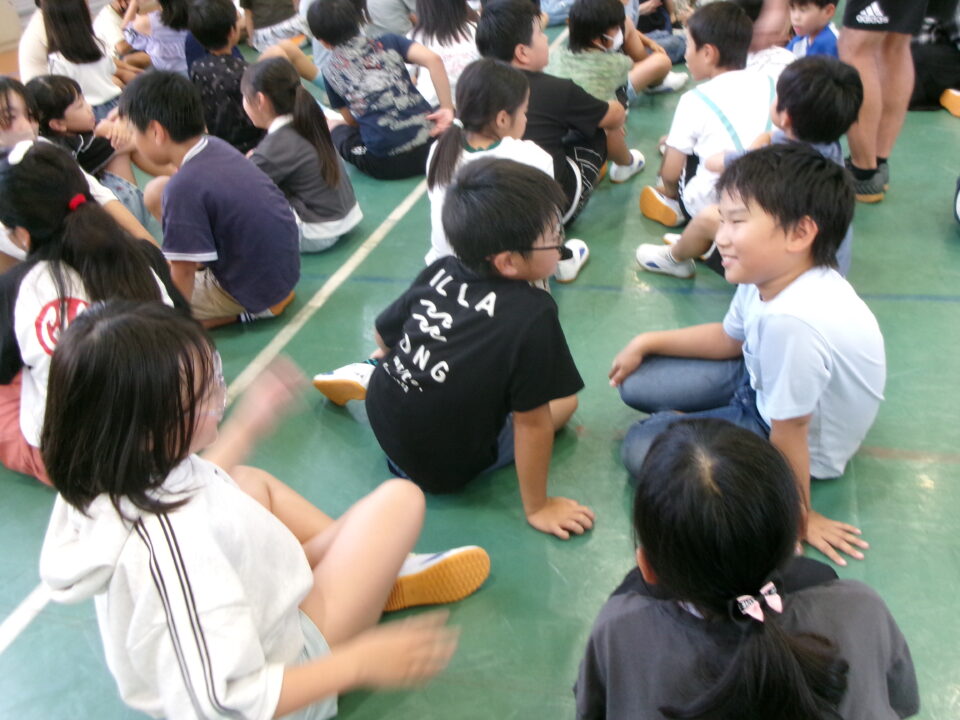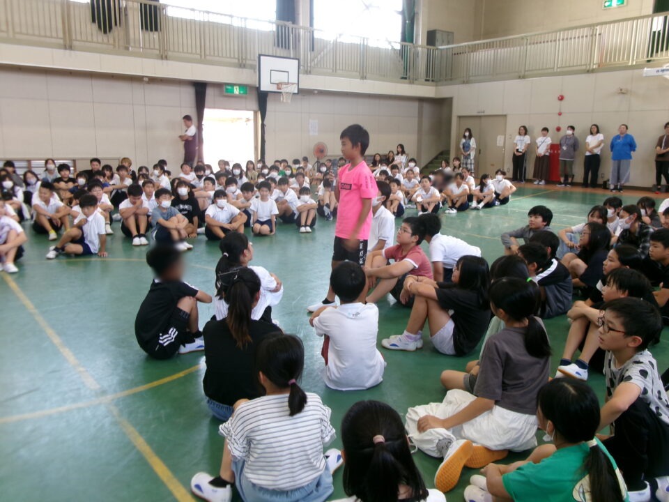 5限目のにっこり集会では、最初に、地域の方とのふれあいコーナーを行いました。いつも登下校を見守ってくださっている地域の方に来ていただき、みんなへメッセージをいただきました。