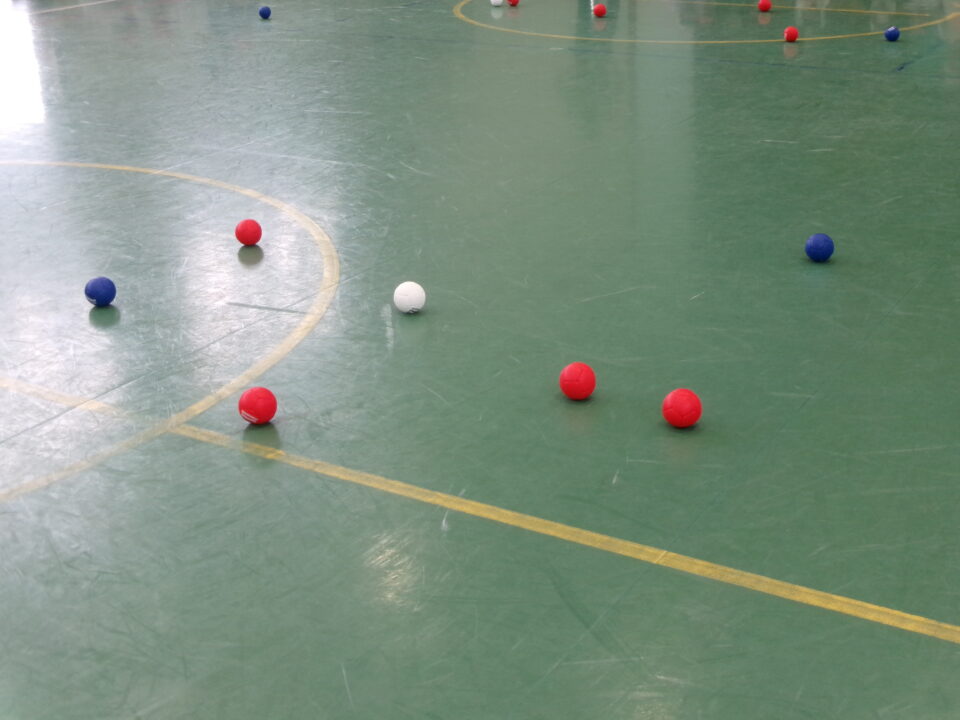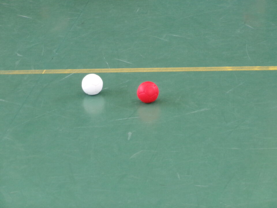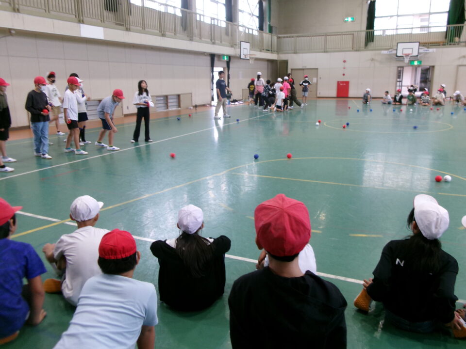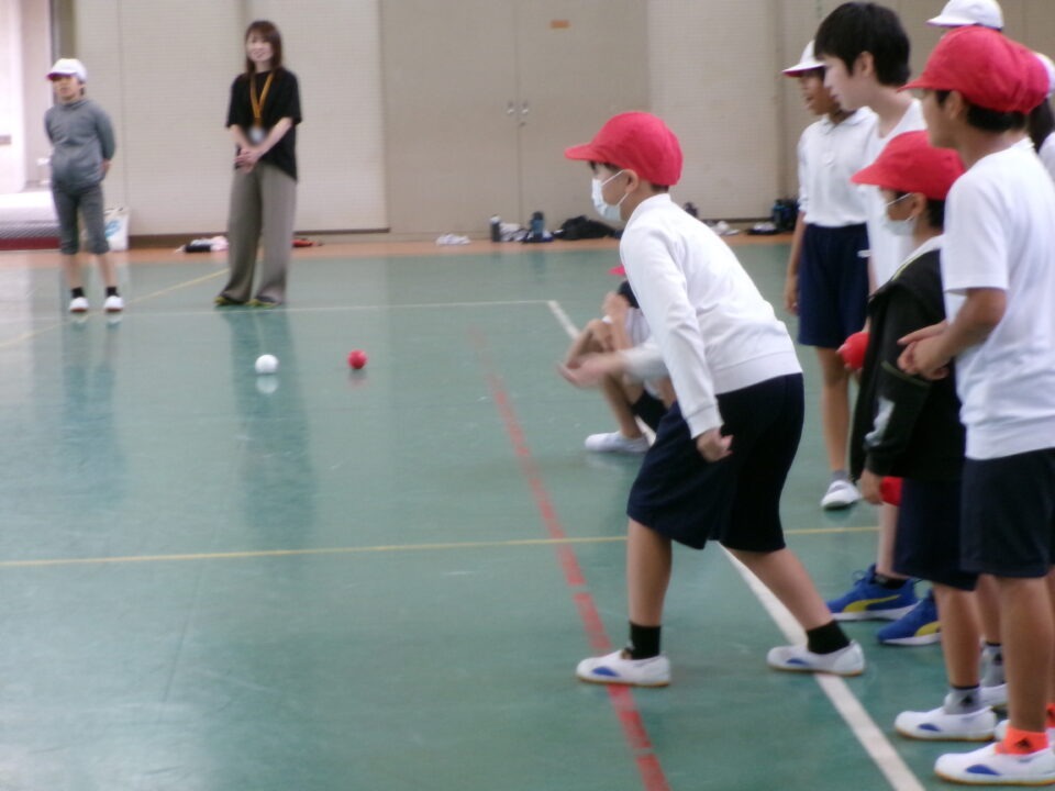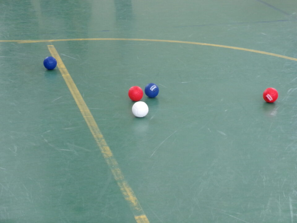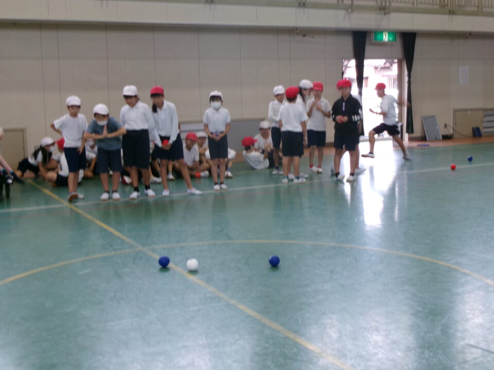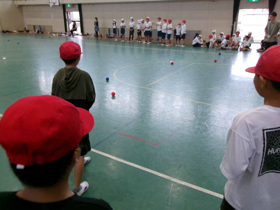 次に、クラス別にボッチャをしました。みんなうまく転がし、白い球に近づけられるようねらって転がしました。1回戦は、どのクラスも赤が勝ちました。