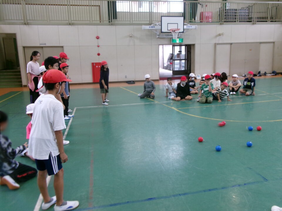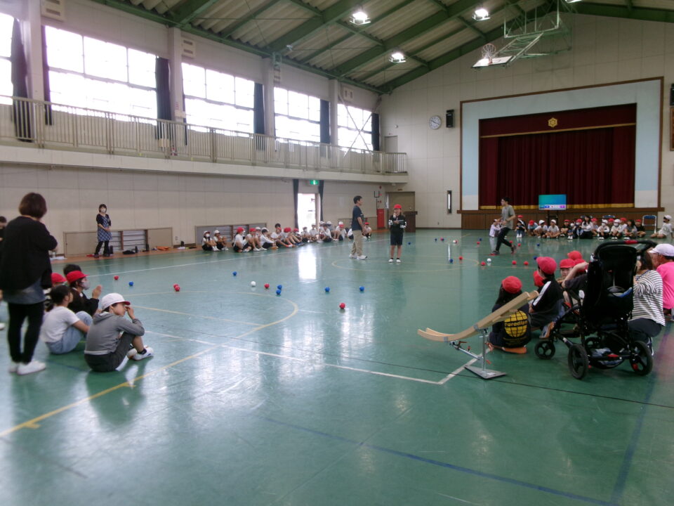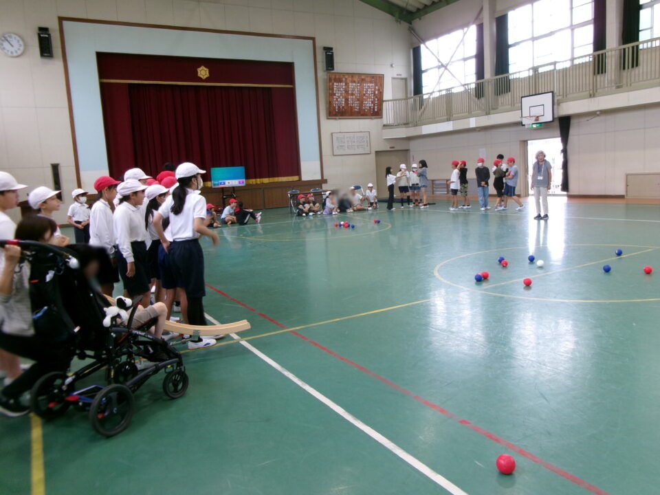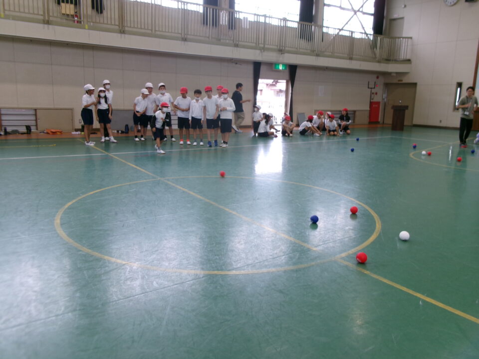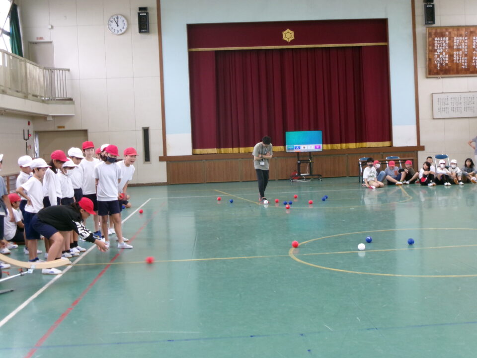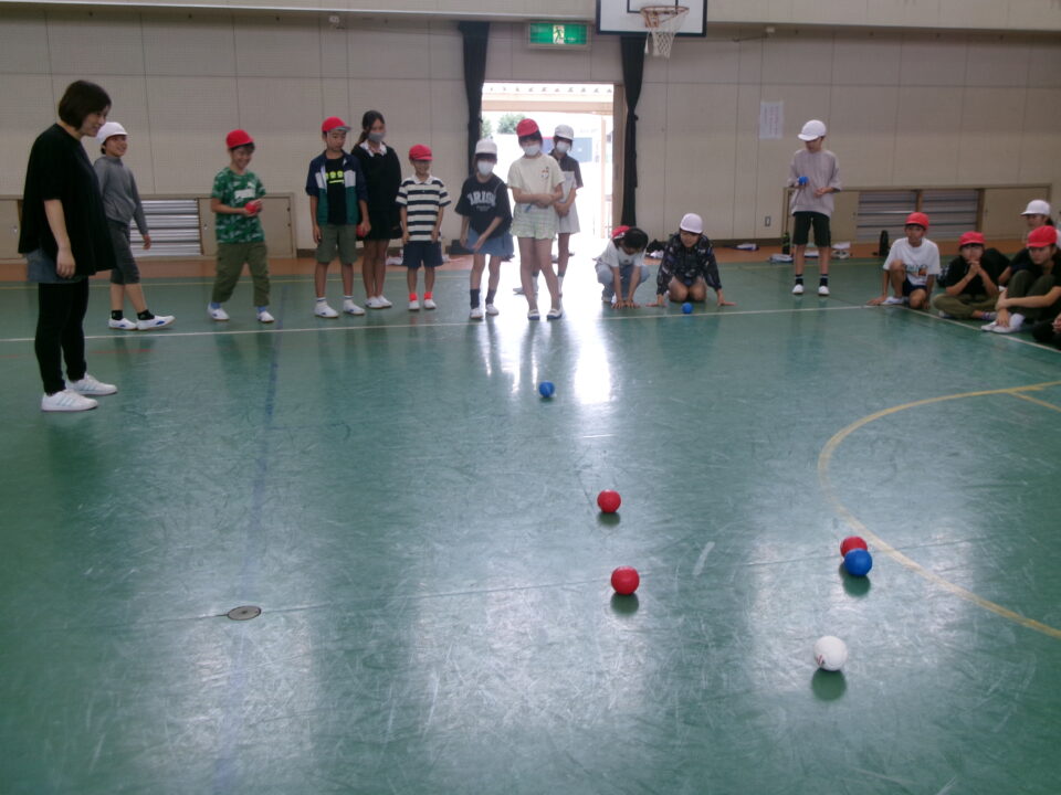 次に、クラス別にボッチャをしました。みんなうまく転がし、白い球に近づけられるようねらって転がしました。1回戦は、どのクラスも赤が勝ちました。