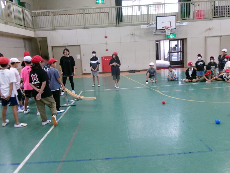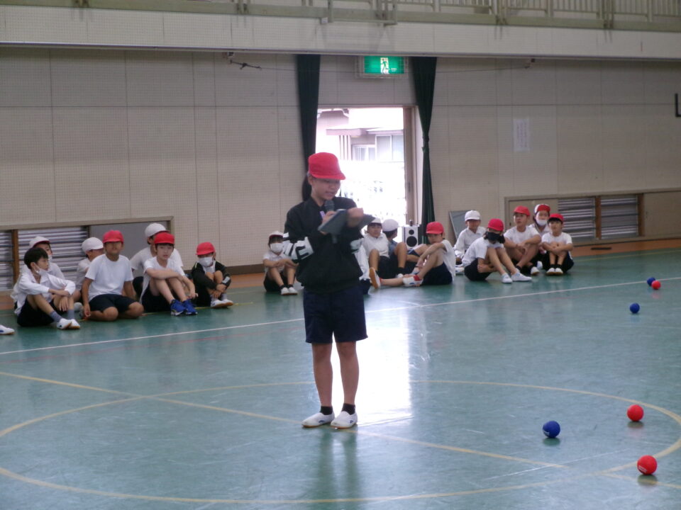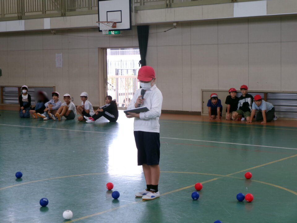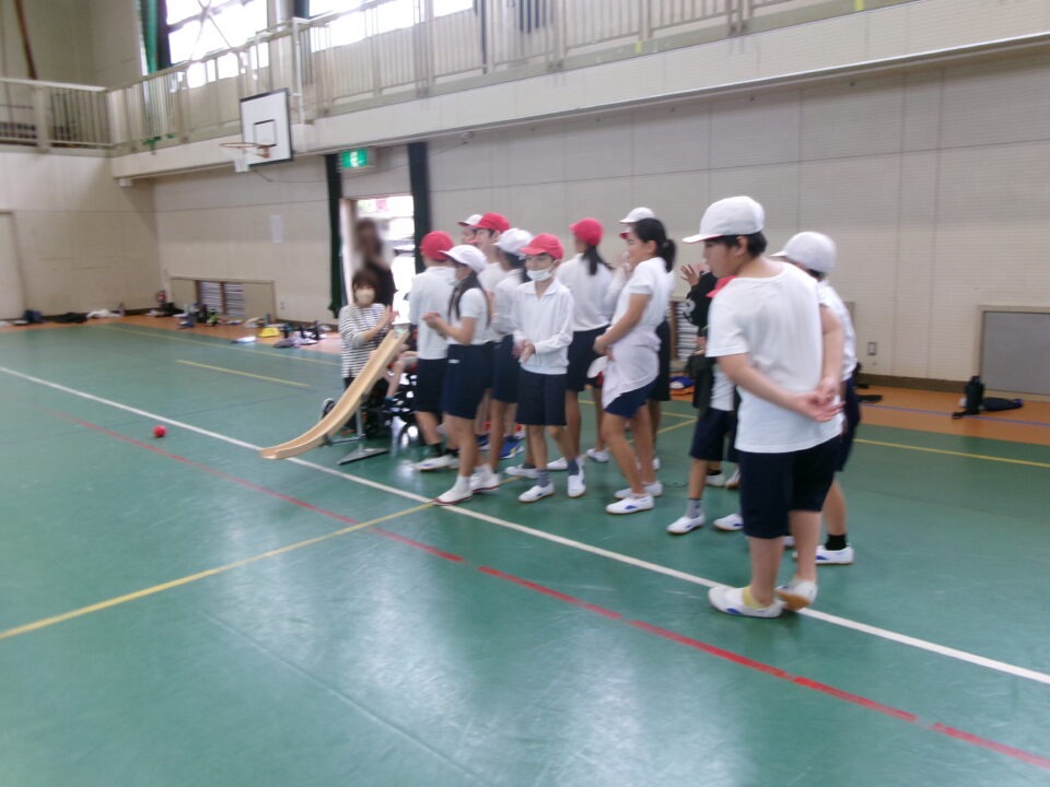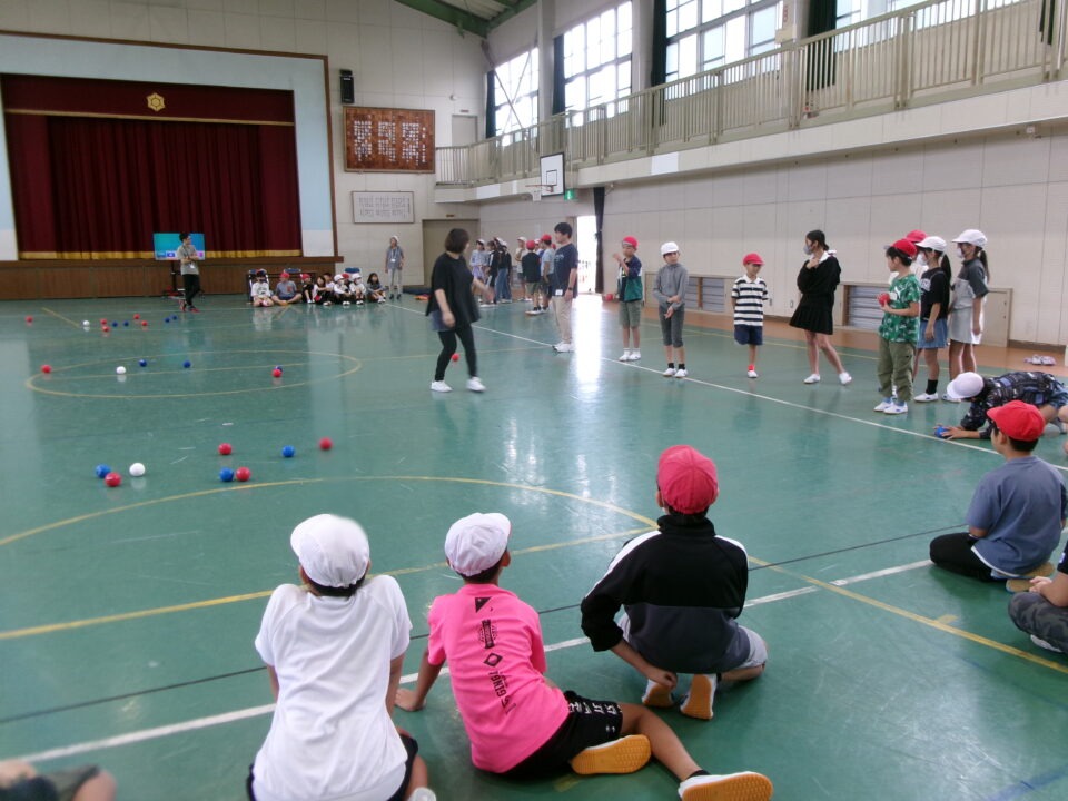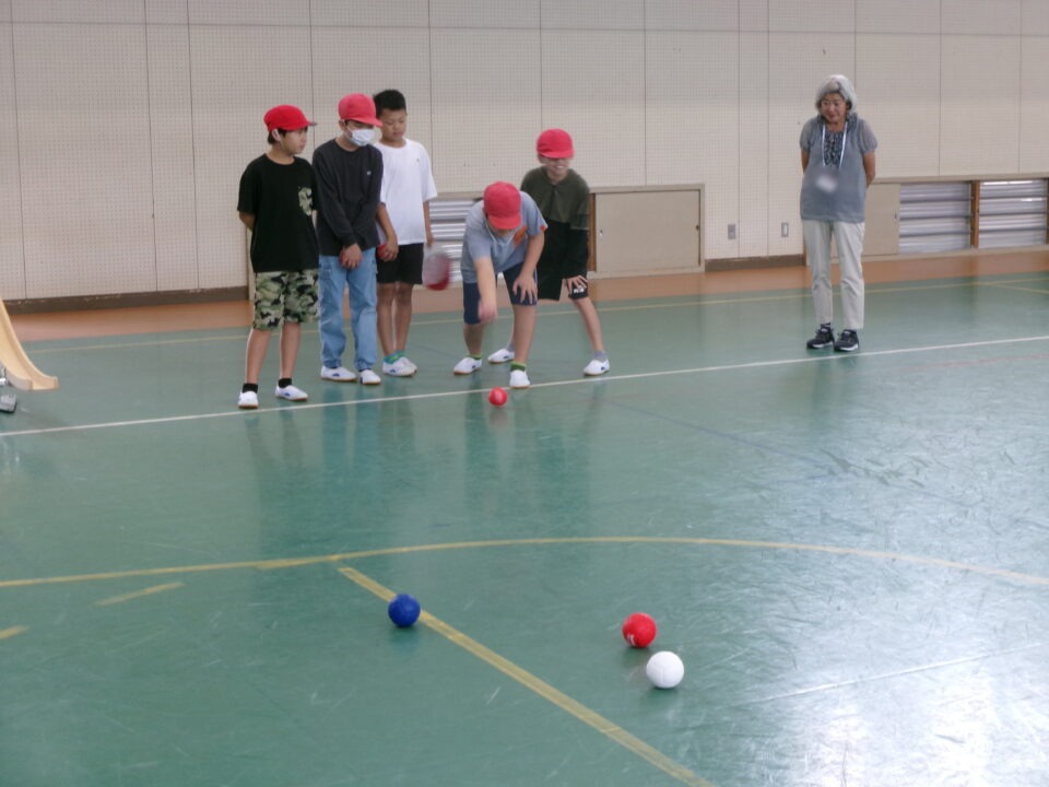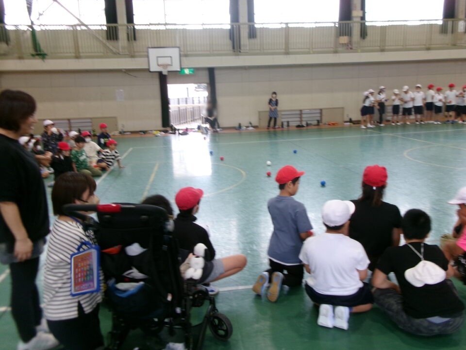次に、クラス別にボッチャをしました。みんなうまく転がし、白い球に近づけられるようねらって転がしました。1回戦は、どのクラスも赤が勝ちました。