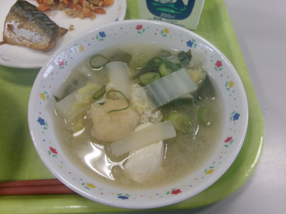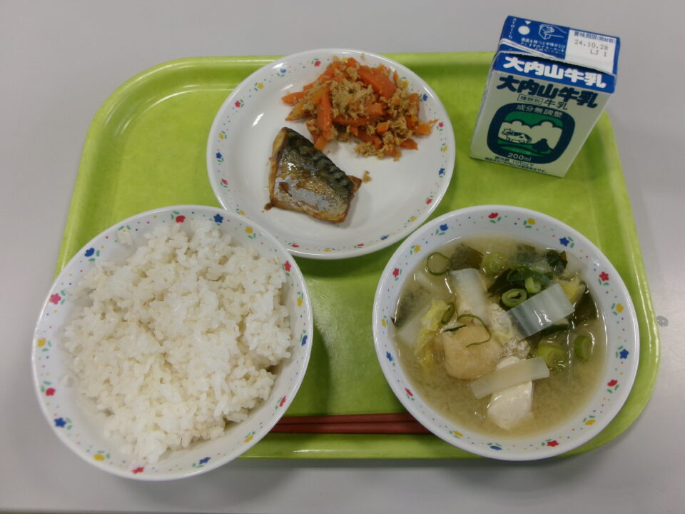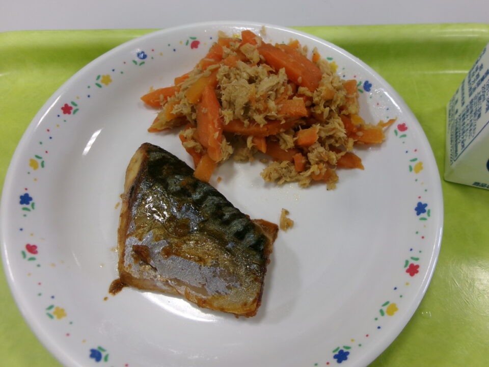メニューは、ご飯(麦入り)、牛乳、さばのカレー焼き、皮ごとにんじんしりしり、白みそ汁でした。