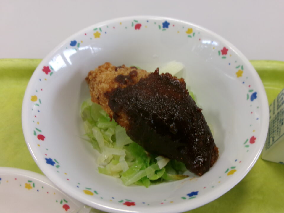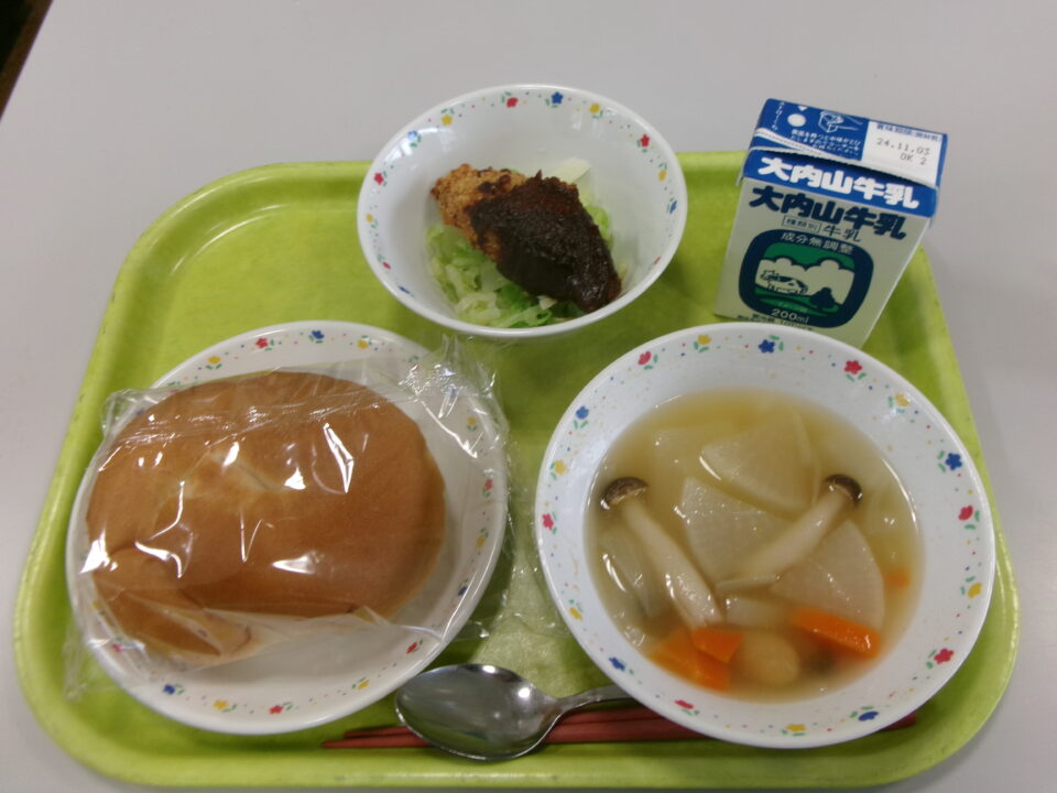 学校の給食は、丸パン(横切り)、まぐろみそカツ、キャベツ、牛乳、ポトフでした。