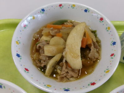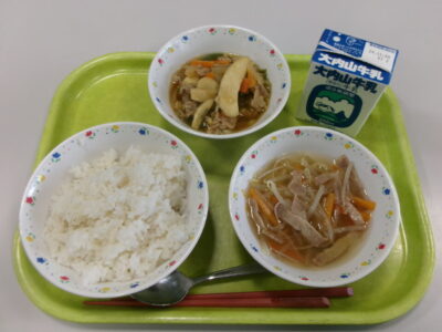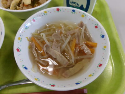 今日の給食は、ご飯(麦入り)、牛乳、豚肉とまこものオイスターソース炒め、もやしとビーフンのスープでした。