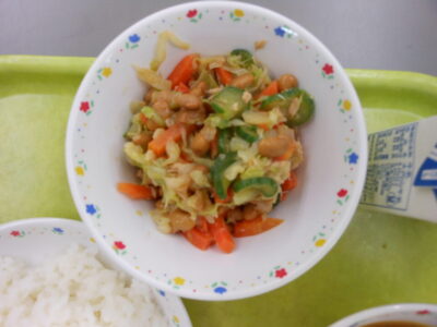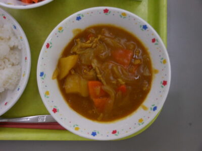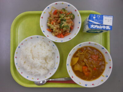 今日の給食は、ポークカレー、牛乳、大豆入りサラダでした。
