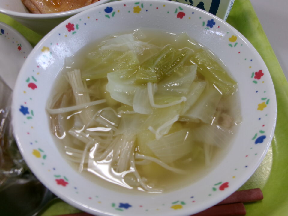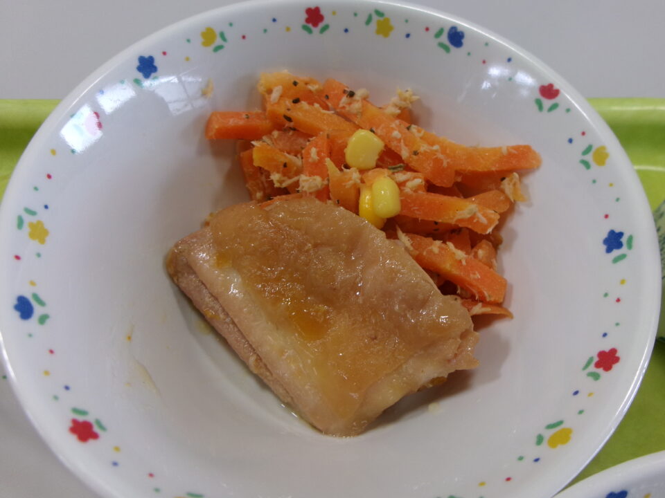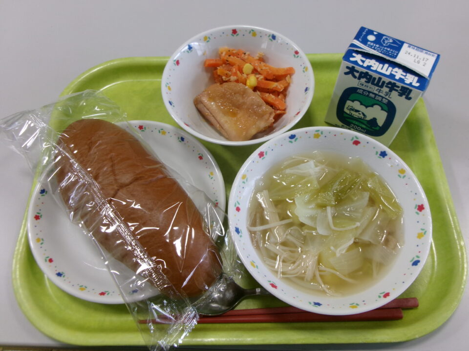今日の給食は、黒糖パン、牛乳、とり肉のマーマレード焼き、皮ごとにんじんラペ、えのきとベーコンのスープでした。