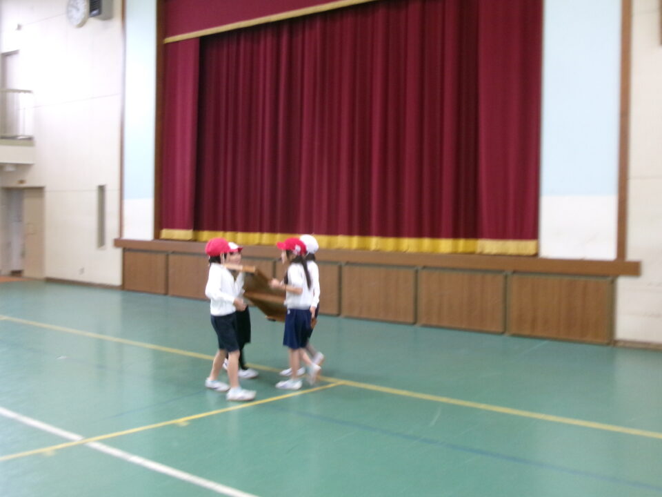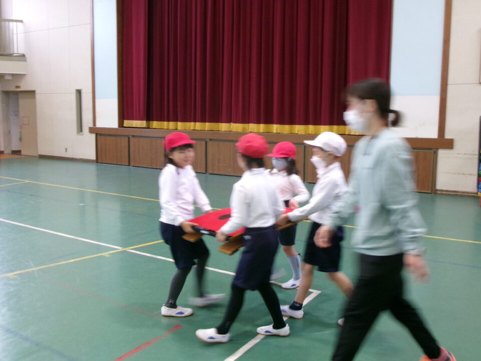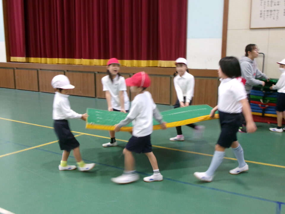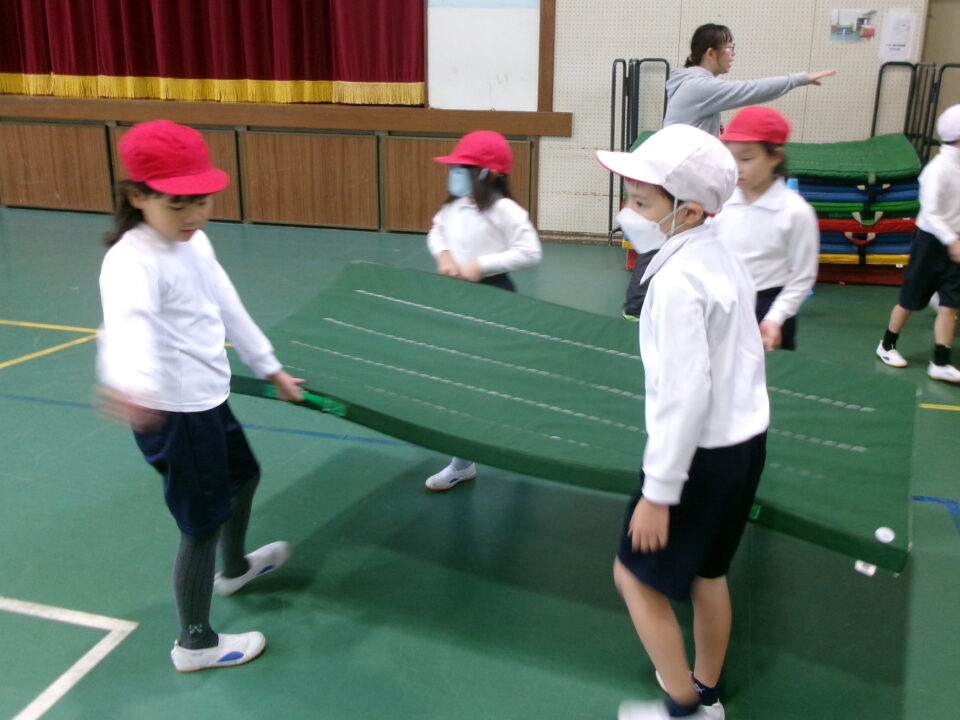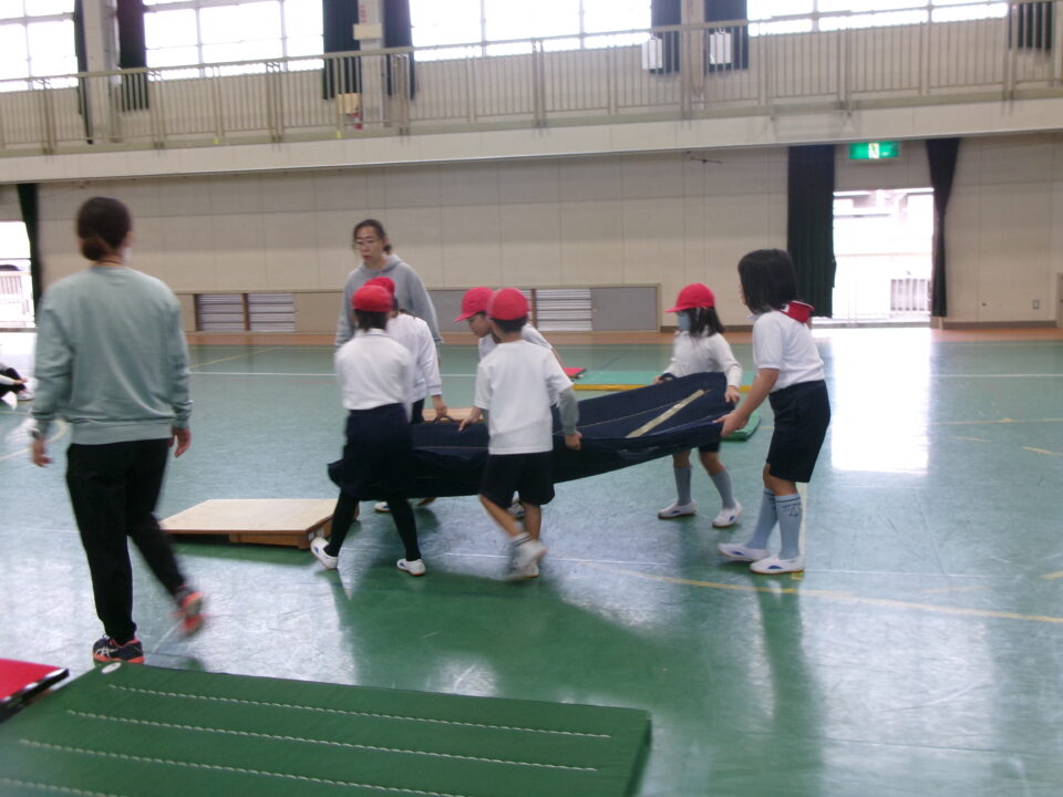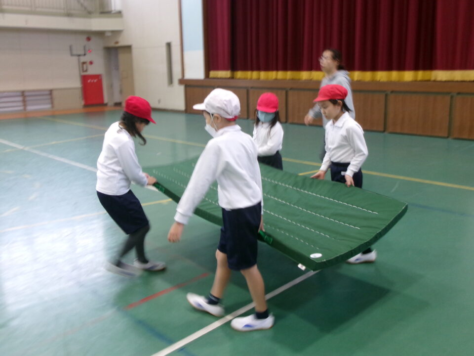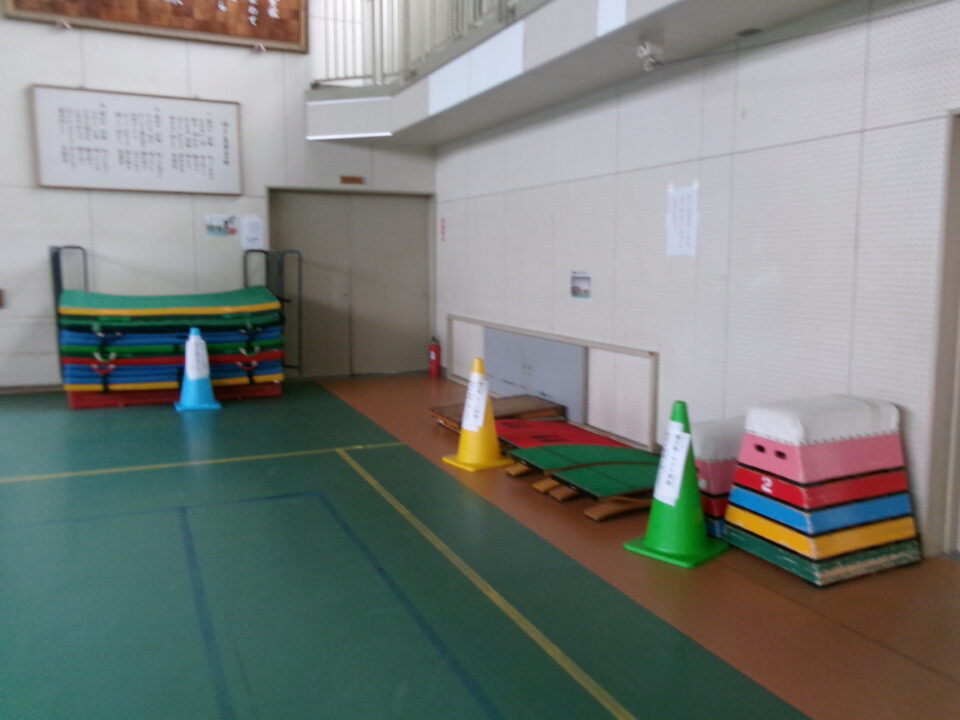 授業の時間45分を確保するために、マット・跳び箱を出しておいてすぐに準備できる『マット・跳び箱週間』を設けています。