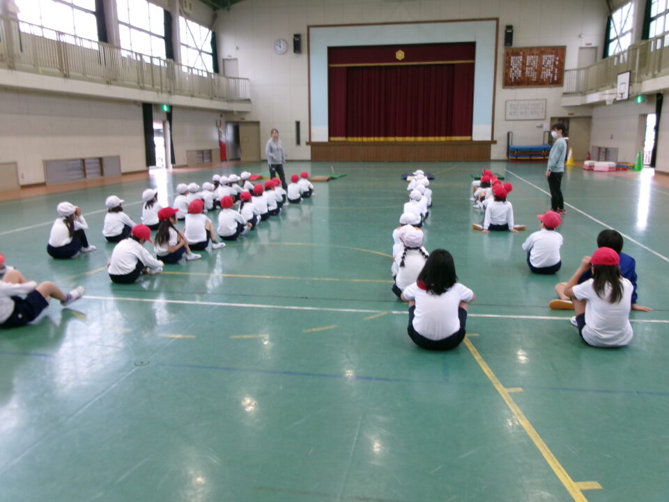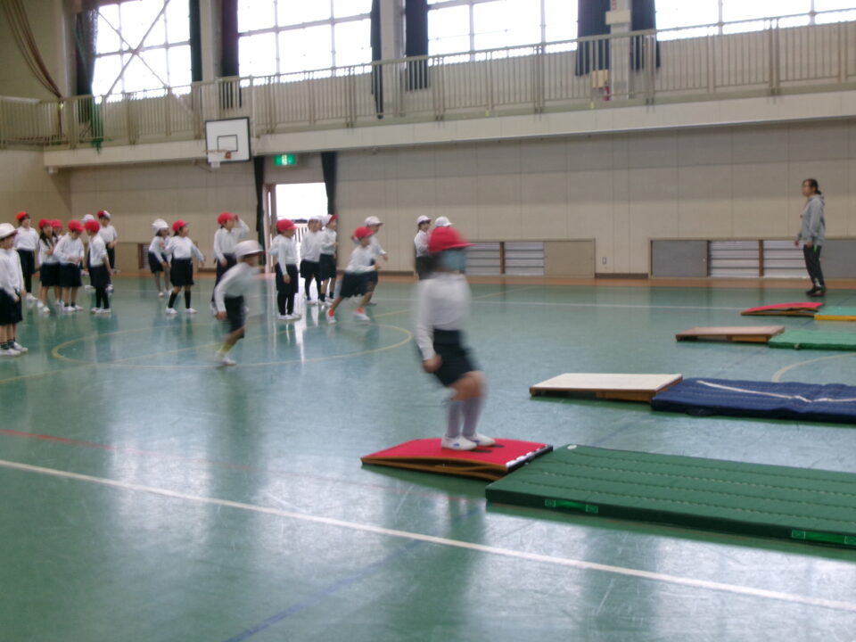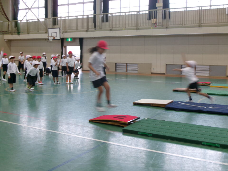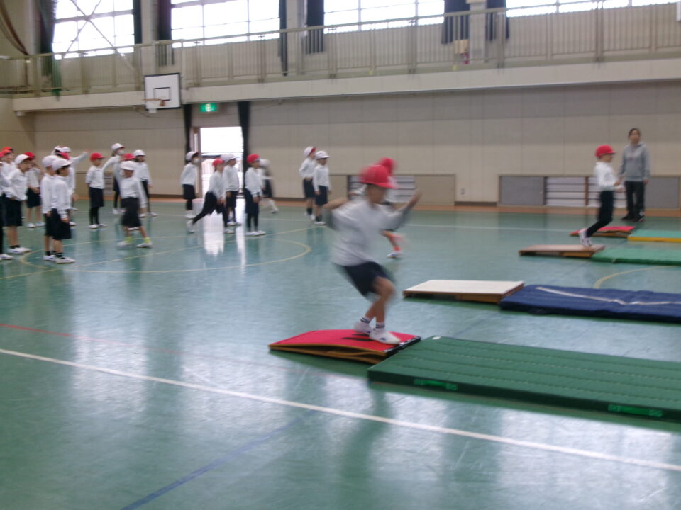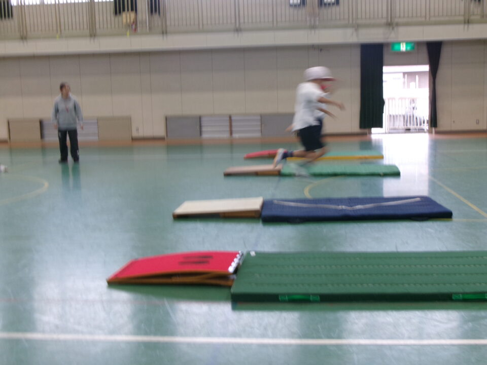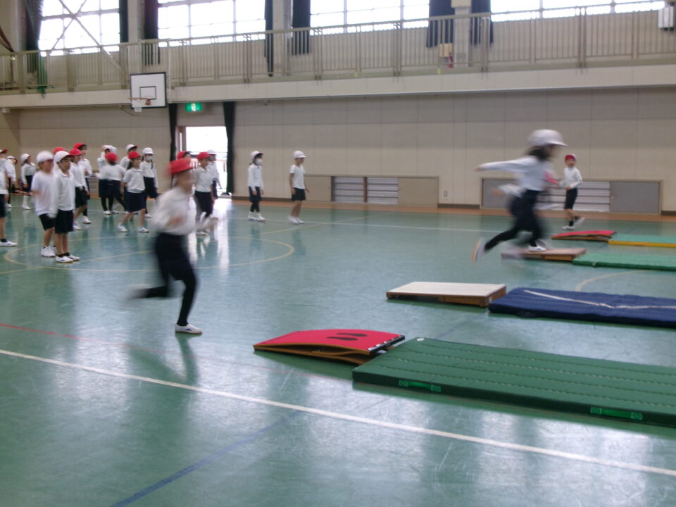 今日は、これから跳び箱学習をするための助走の練習をしました。ふみきりを両足で力強く踏み込み、ジャンプする練習です。