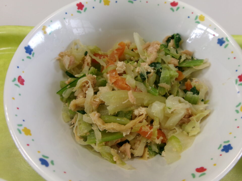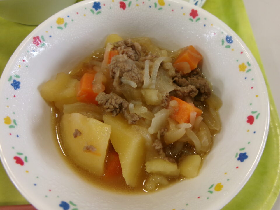 今日の給食は、ご飯、牛乳、肉じゃが、小松菜と油揚げの和え物でした。