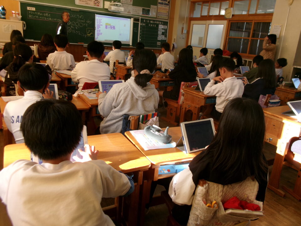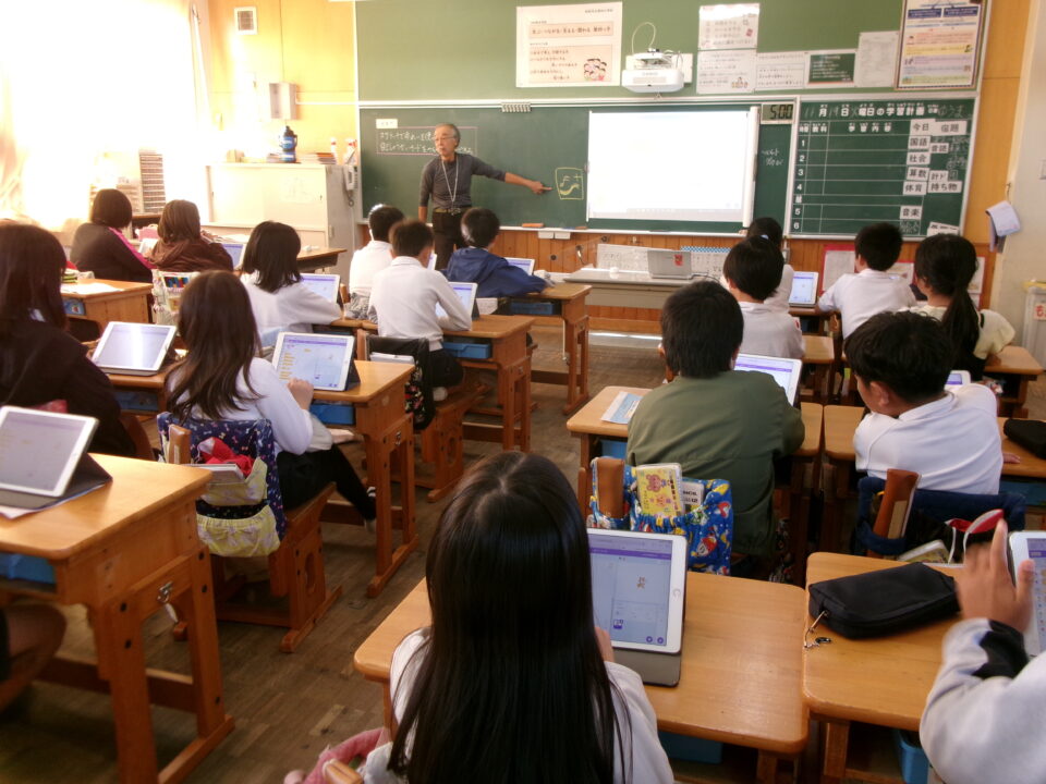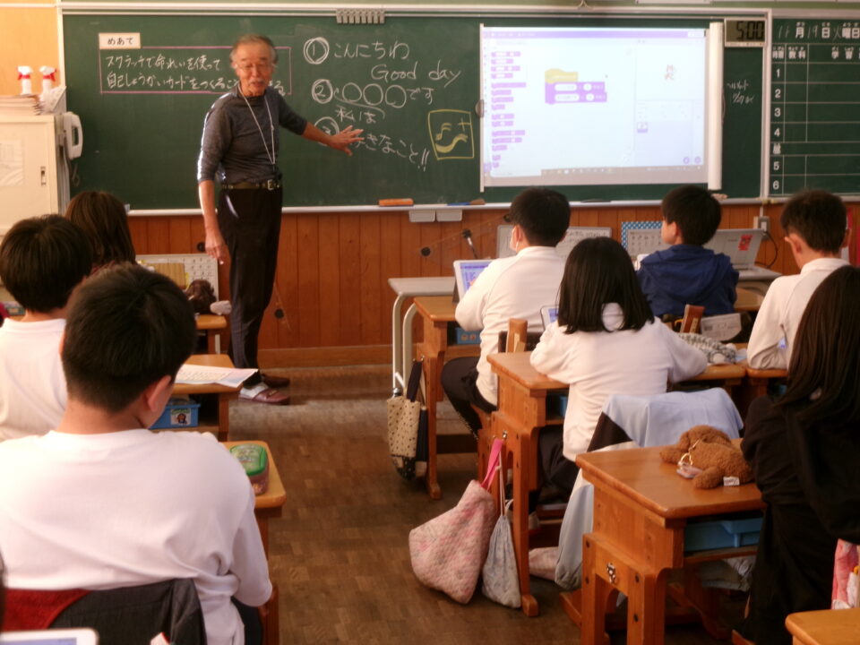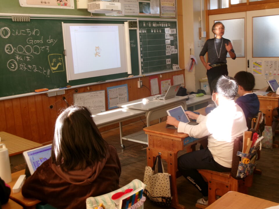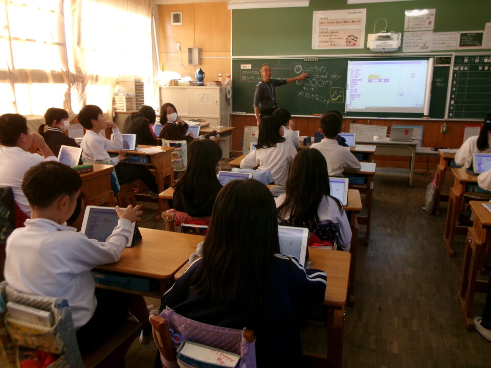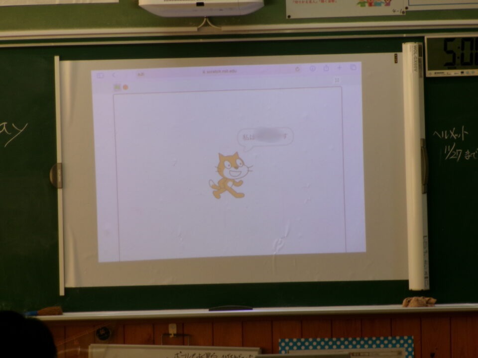 今日きょうは、4-1がプログラミング学習がくしゅう三重大みえだい工学博士こうがくはかせていただき、プログラミングによる作曲さっきょくやスクラッチで自己紹介じこしょうかいまなびました。