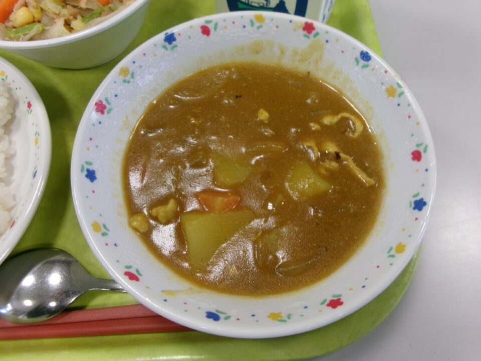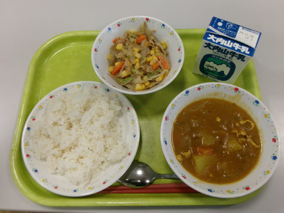 今日の給食は、ご飯(麦入り)、チキンカレー、牛乳、ごぼうのさっぱりサラダでした。