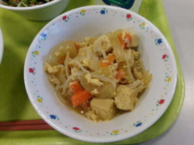 今日きょう給食きゅうしょくは、ごはん麦入むぎいり)、牛乳ぎゅうにゅう高野豆腐こうやどうふたまごとじ、ほうれんそうののり酢和ずあえでした。