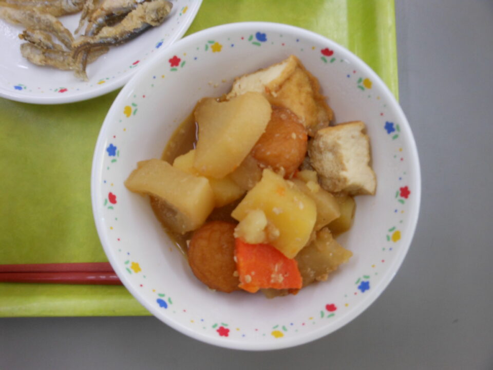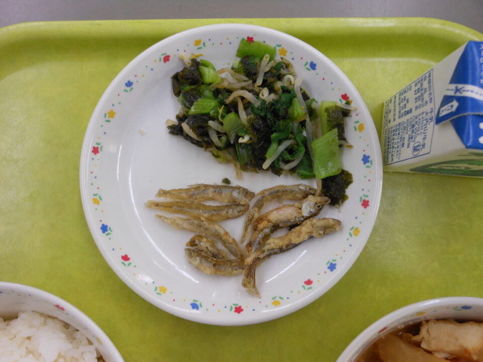 今日の給食は、ご飯、牛乳、わかさぎの唐揚げ、チンゲンサイの磯和え、厚揚げのほっこり煮でした。
