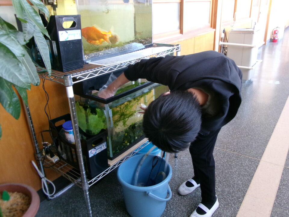 5,6年生の子たちは委員会活動です。20分休みには、飼育委員の人は、えさやりと水槽のそうじをしていますね。