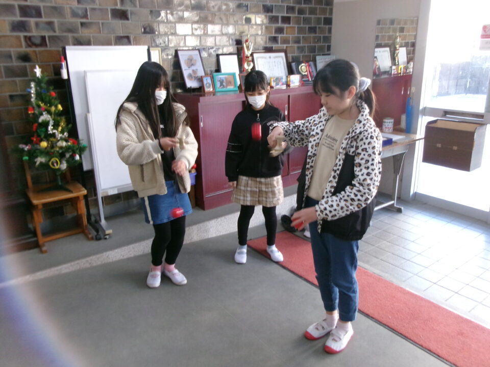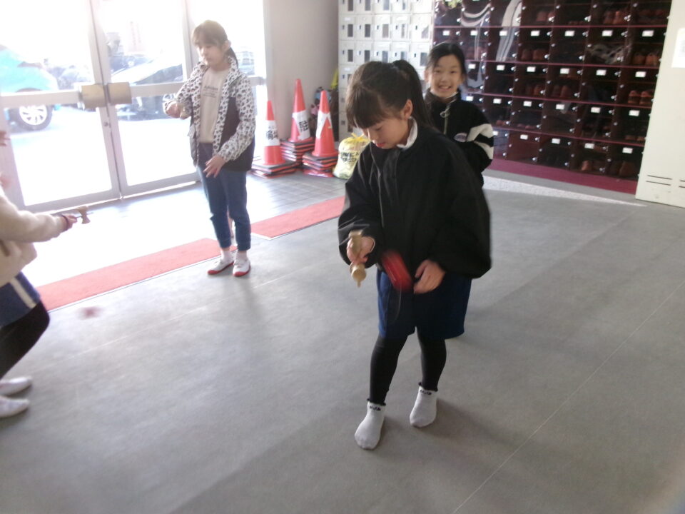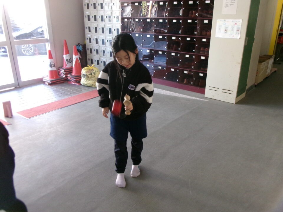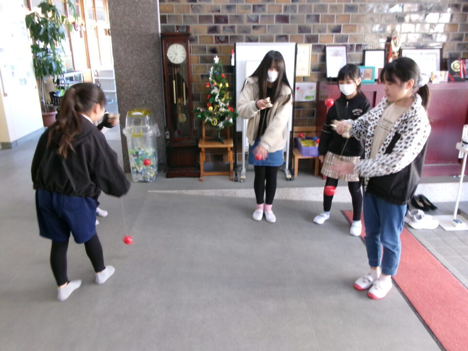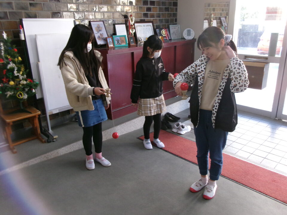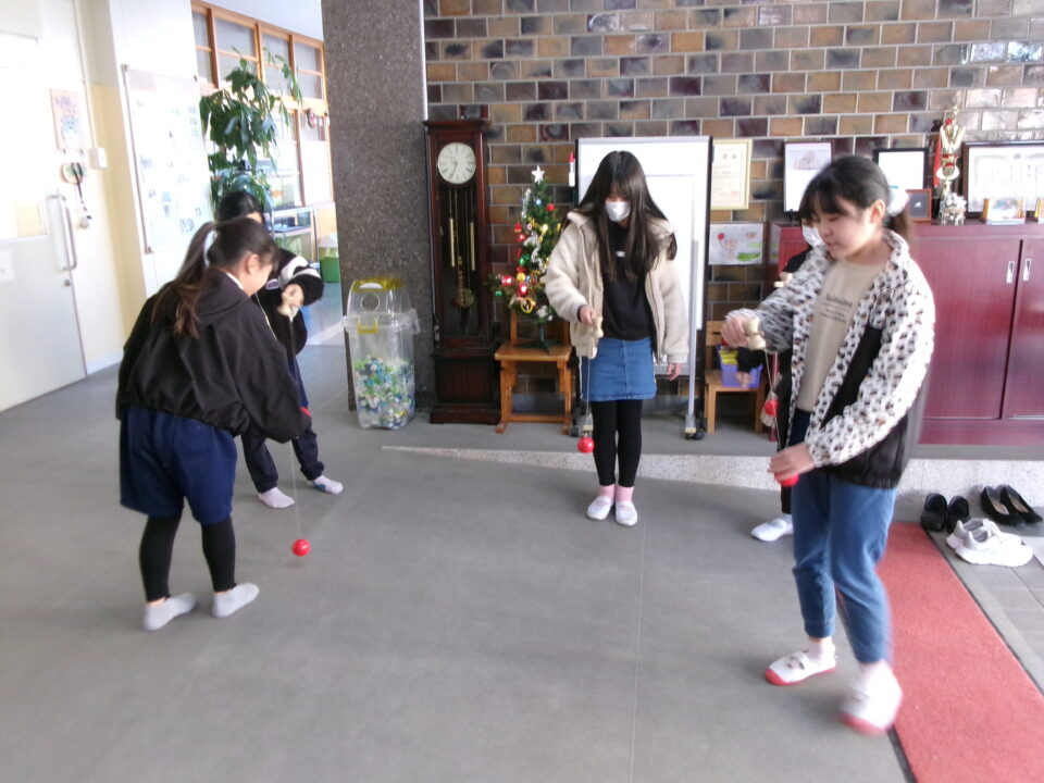 校舎内でも子どもたちはいろいろ考えて休憩を取っていました。職員室前玄関では、けん玉コーナーがあります。今年も毎時間、練習をしに来てめきめきと上達しています。