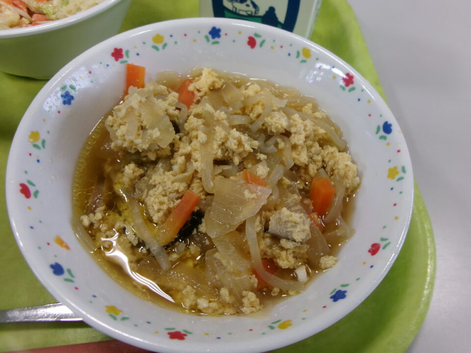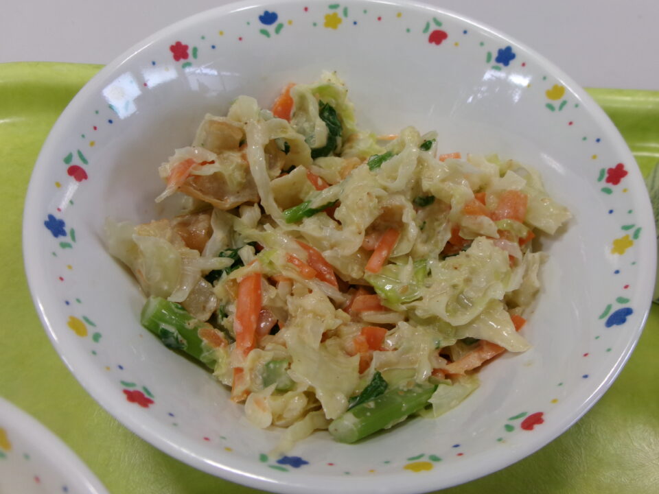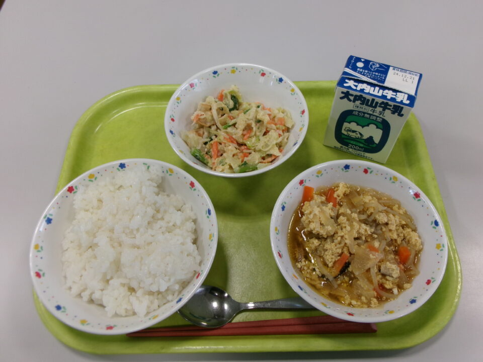 今日の給食は、ご飯、親子煮、牛乳、なばなのごまマヨネーズ和えでした。