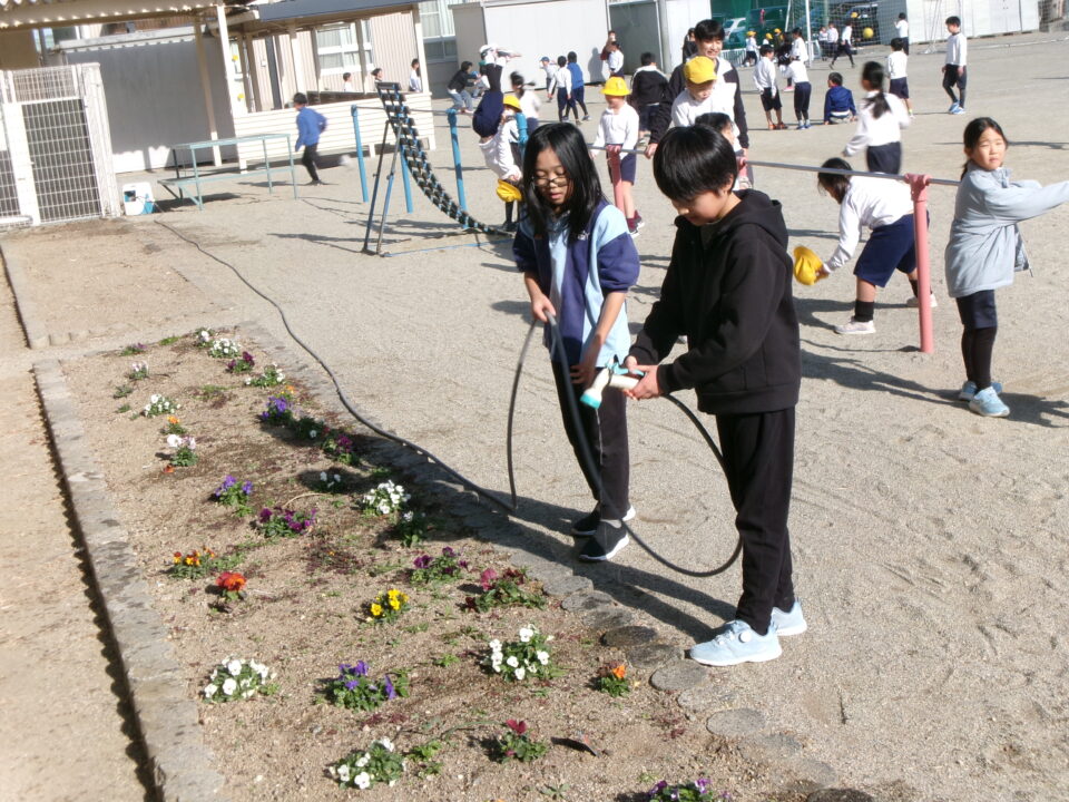 昼休みの様子です。委員会の仕事では、整美委員さんが花の水やりをしていますね。