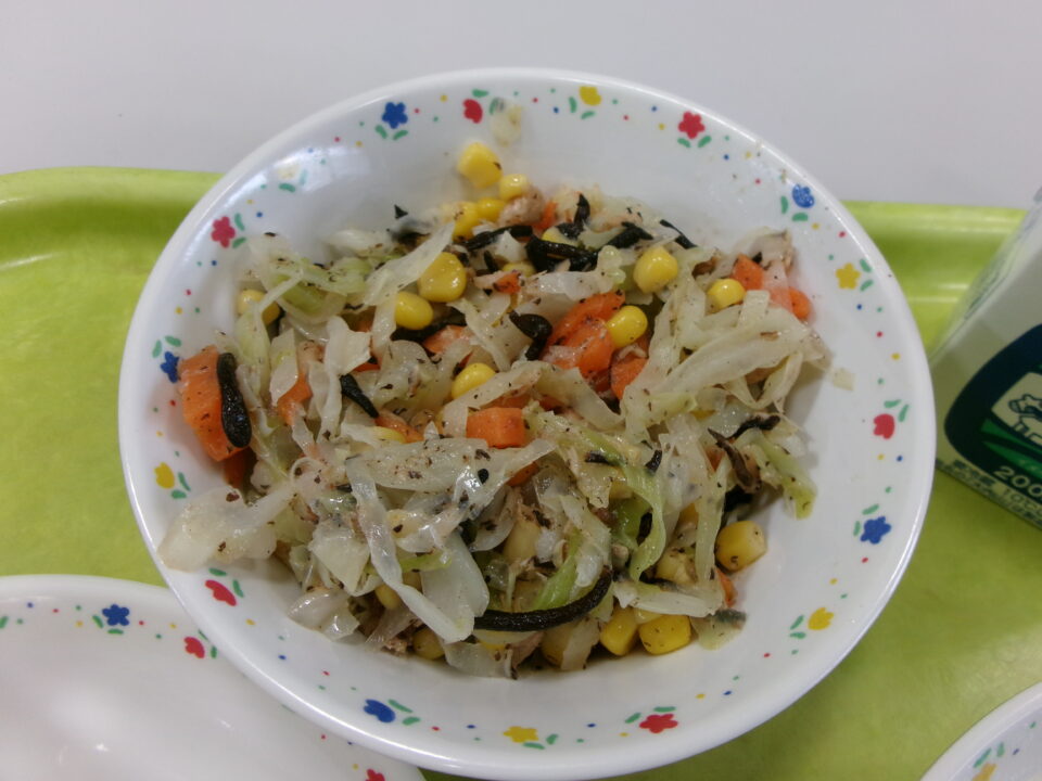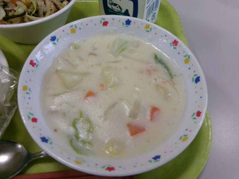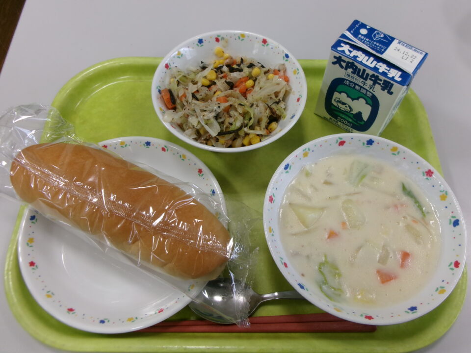 今日の給食は、米粉入りパン、牛乳、白菜の米粉ポタージュ、ひじきサラダでした。