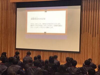 鎌田中学校では、総合の時間に防災をテーマに探究学習をしています。