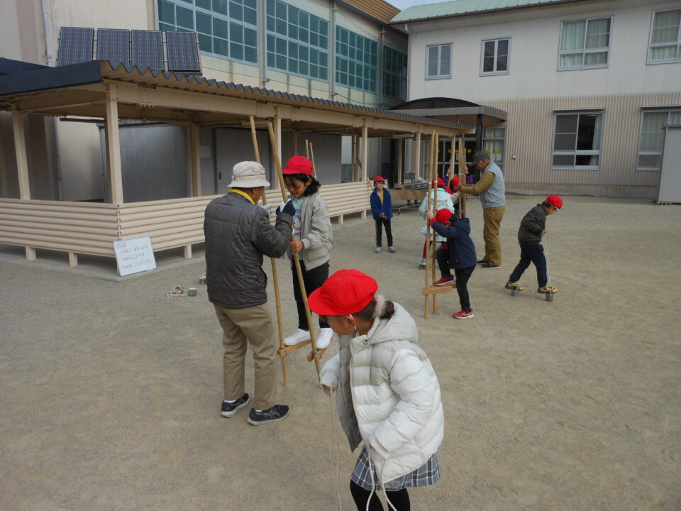 運動場では、たこあげ、竹馬、竹ぽっくりをしました。