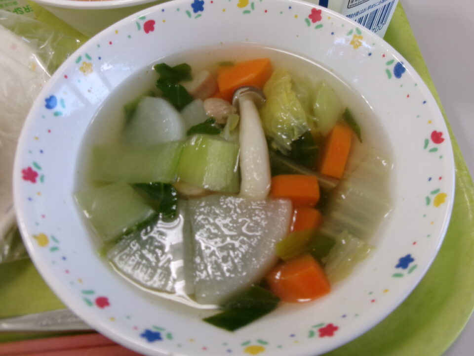 まるパン(横切よこぎり)、牛乳ぎゅうにゅう野菜やさいのスープ、キャベツは共通きょうつうです。