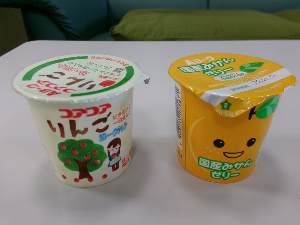 国産こくさんみかんゼリー か りんごヨーグルトのどちらかをえらびました。