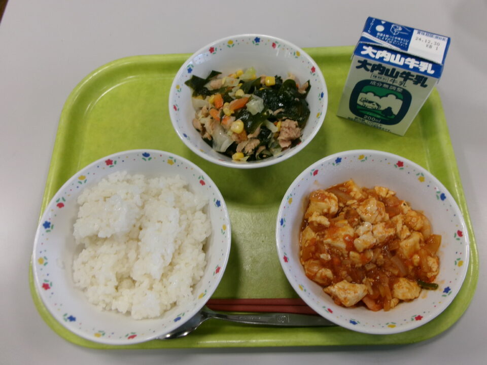 今日の給食は、ご飯、牛乳、豆腐とえびのチリソース煮、わかめサラダでした。