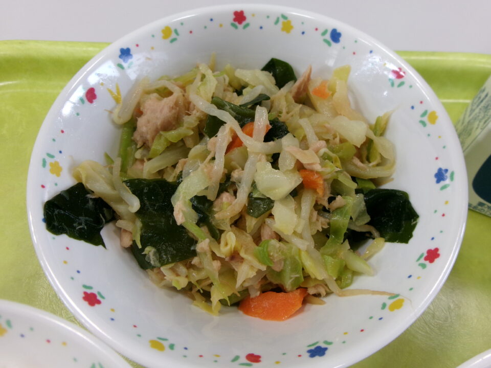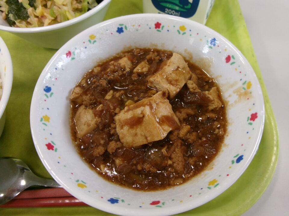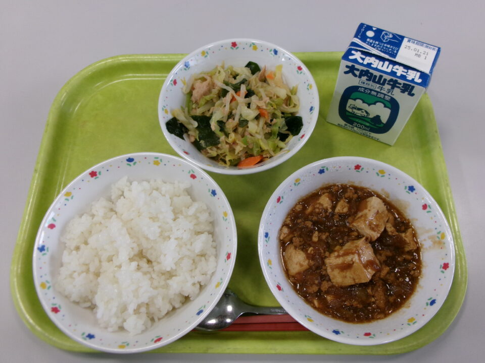ご飯、牛乳、マーボー豆腐、キャベツとわかめの中華風和え物でした。