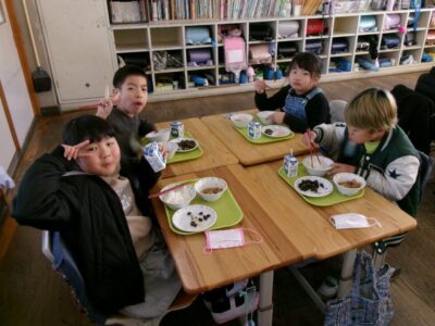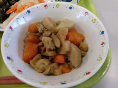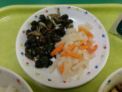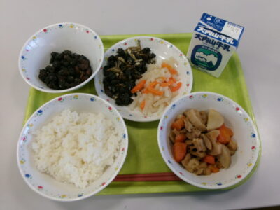 ご飯、牛乳、黒豆と小魚のあまがらめ、紅白なます、筑前煮でした。