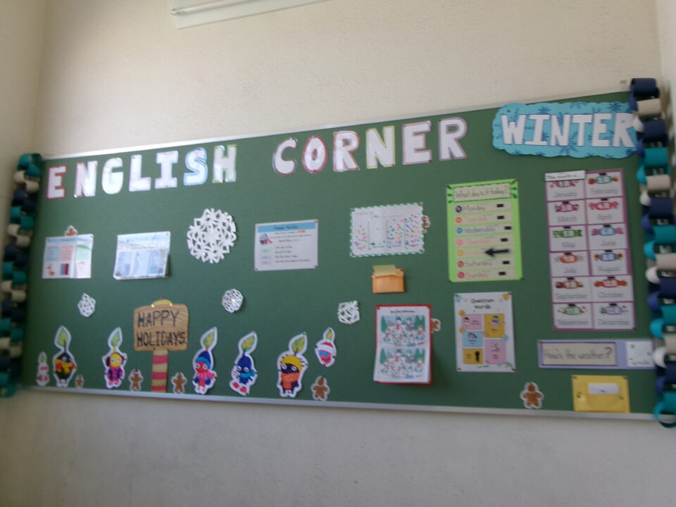 4年生階段の掲示板にある『英語コーナー』も冬バージョンになっていますね。