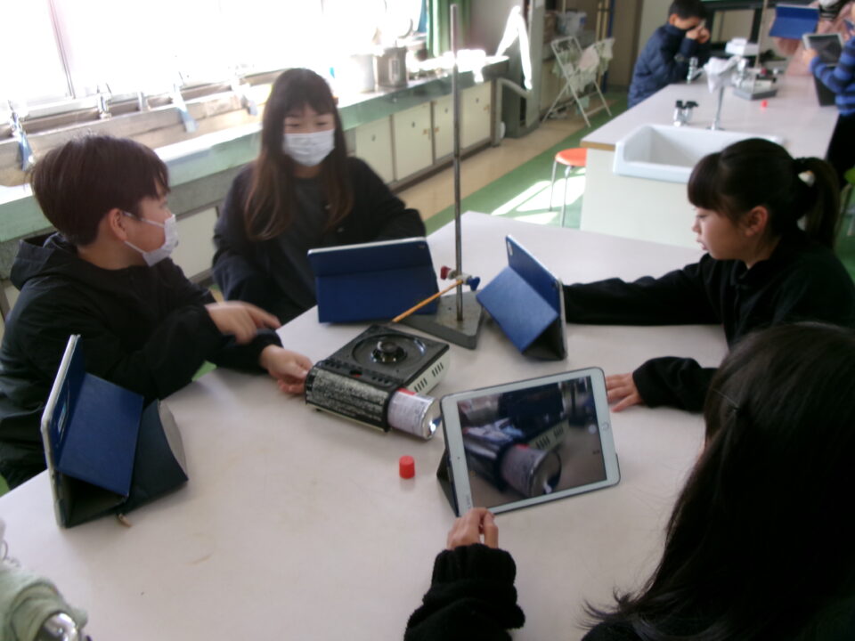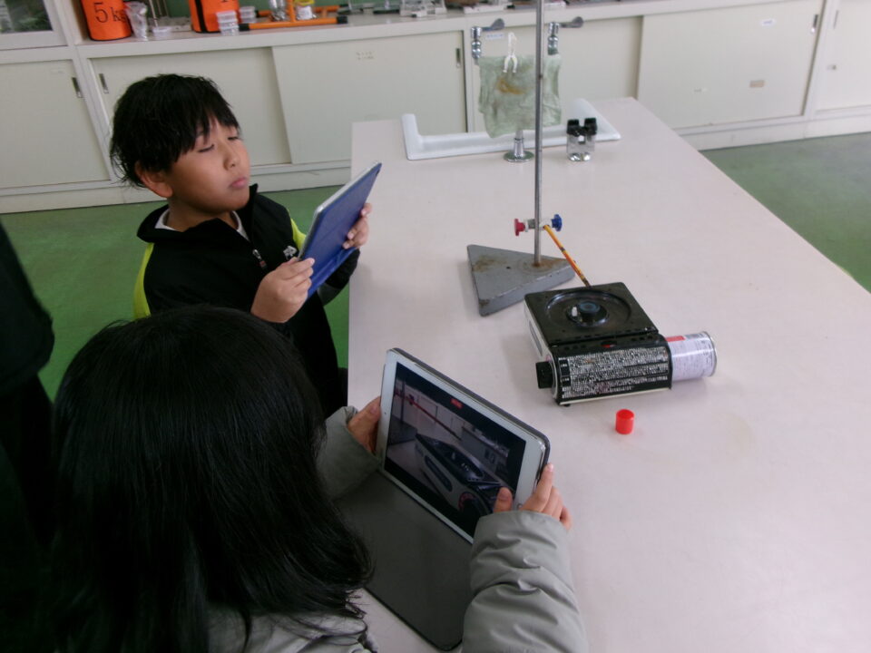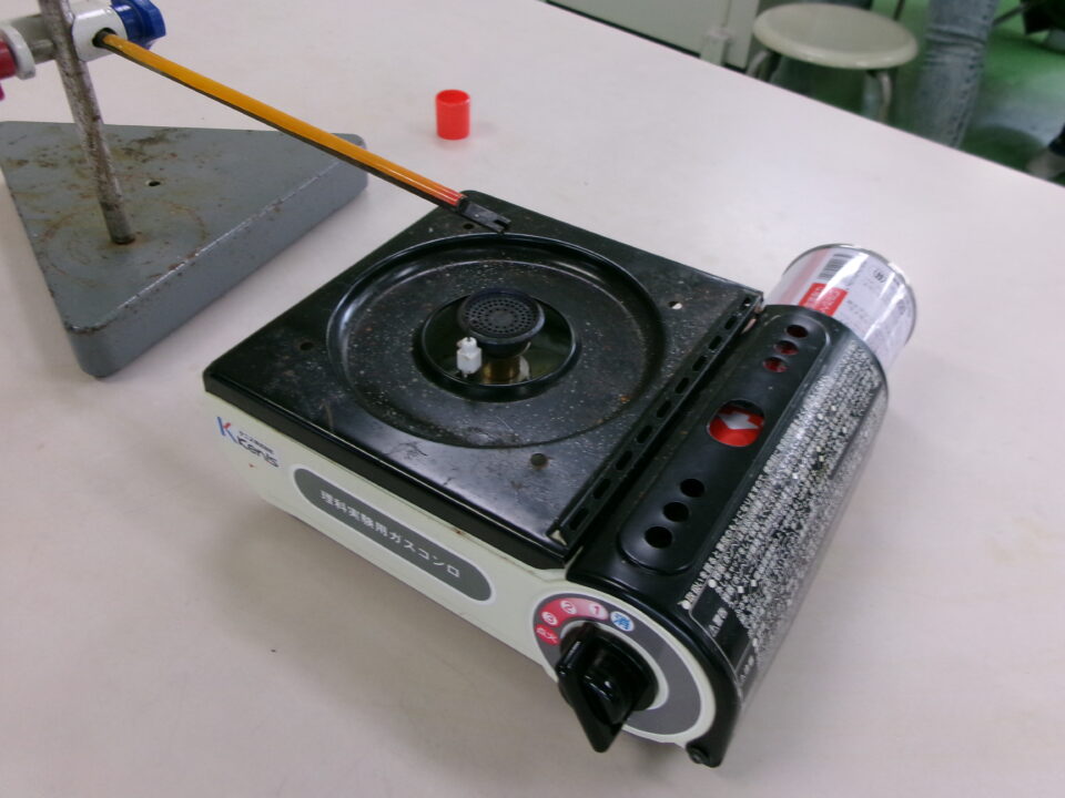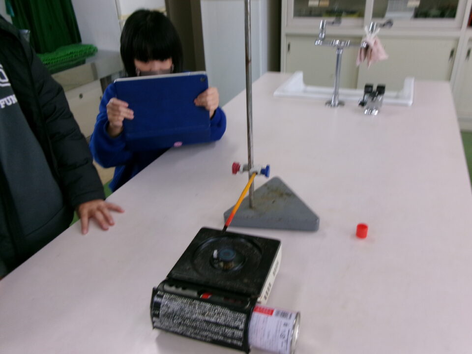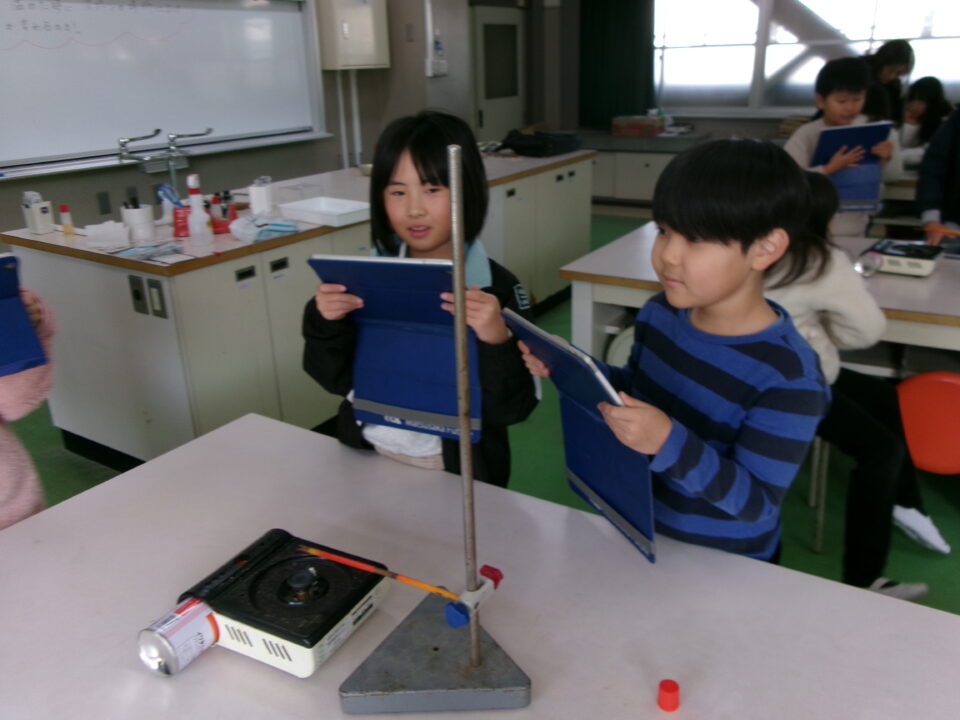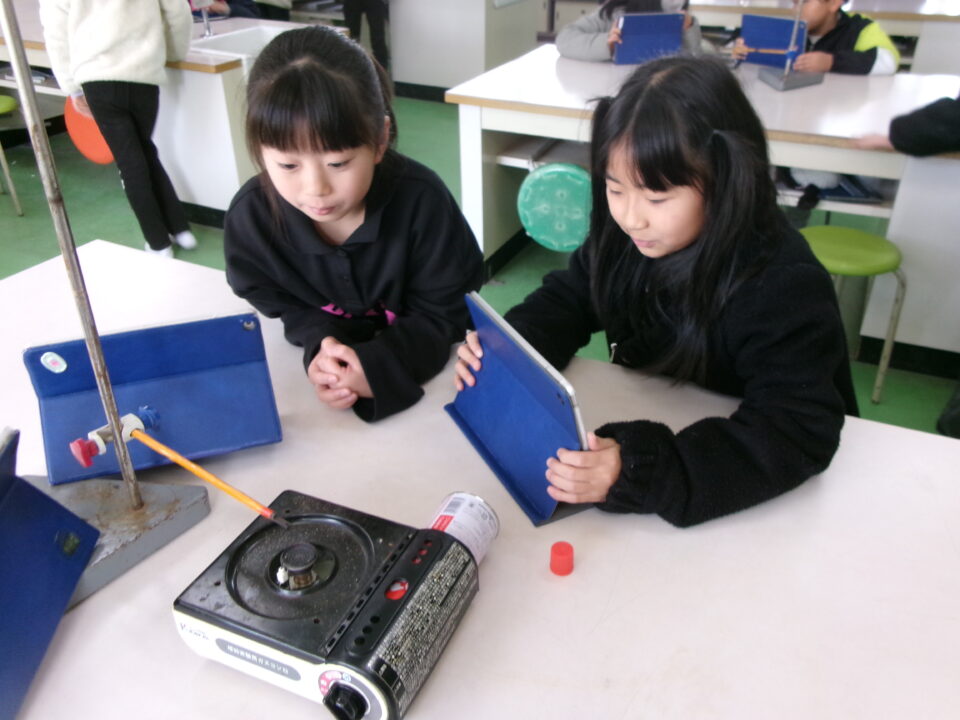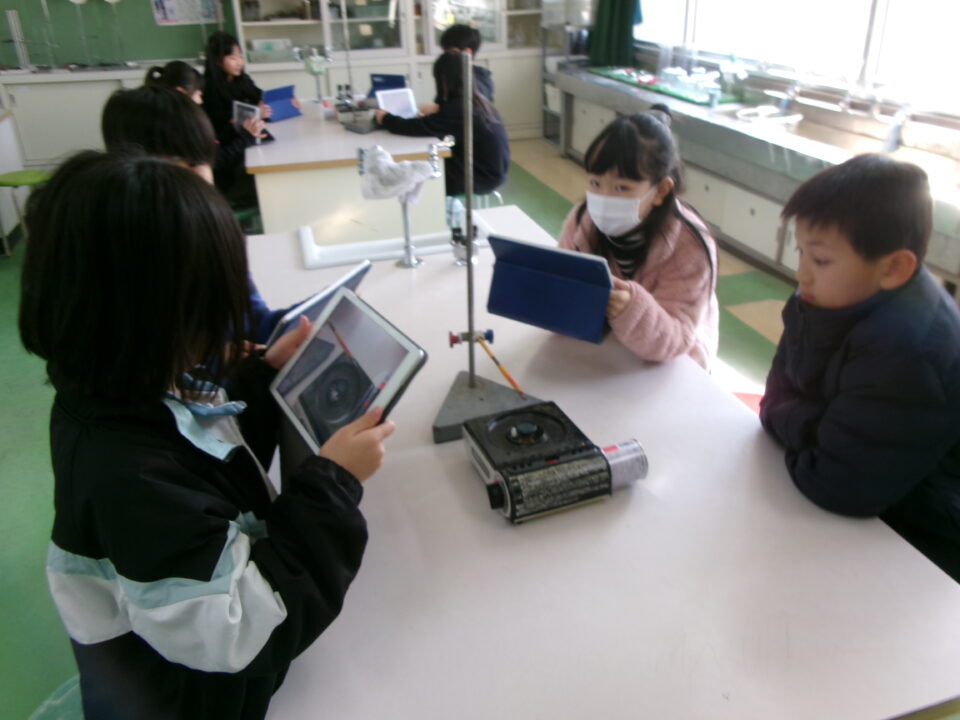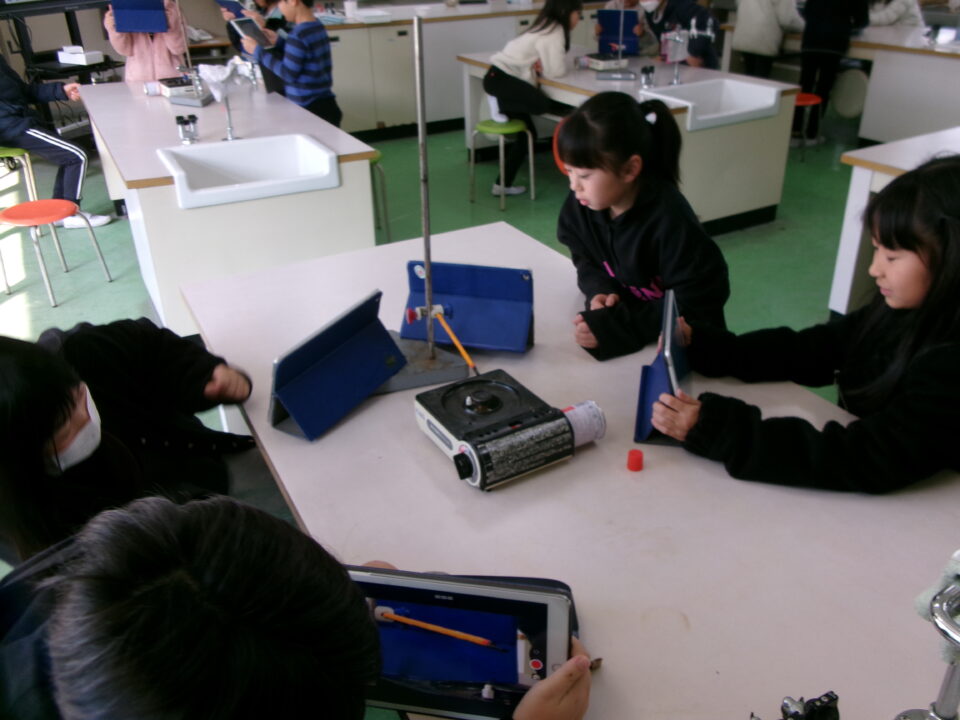 4-2は、理科でした。『熱の伝わり方』について、カセットコンロの火を使い、鉄の棒を熱して、サーモテープで熱の伝わり方を観察しました。