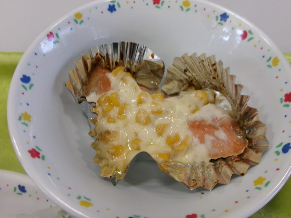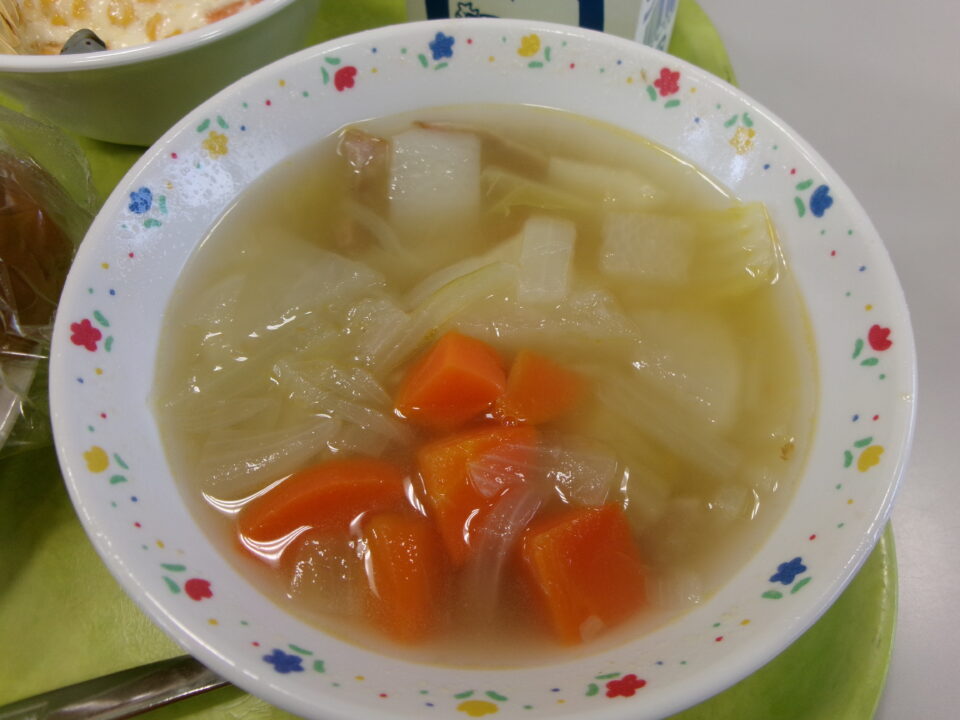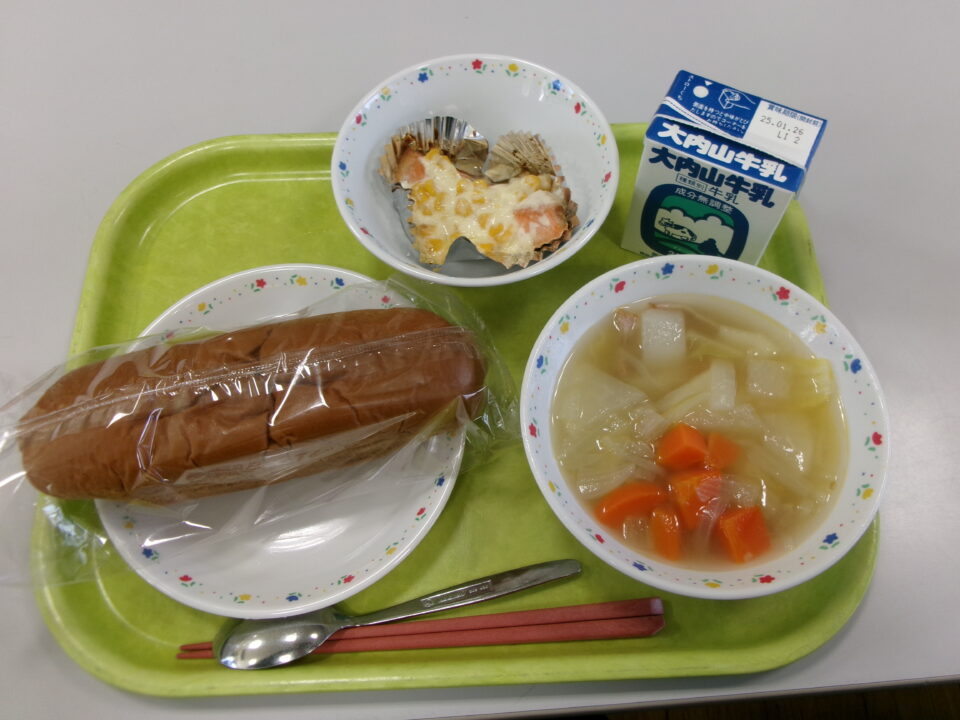 今日の給食は、黒糖パン、牛乳、さけの粒コーン焼き、冬野菜のポトフでした。