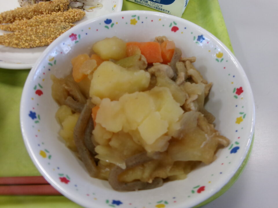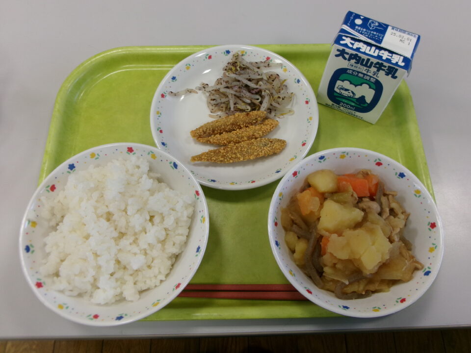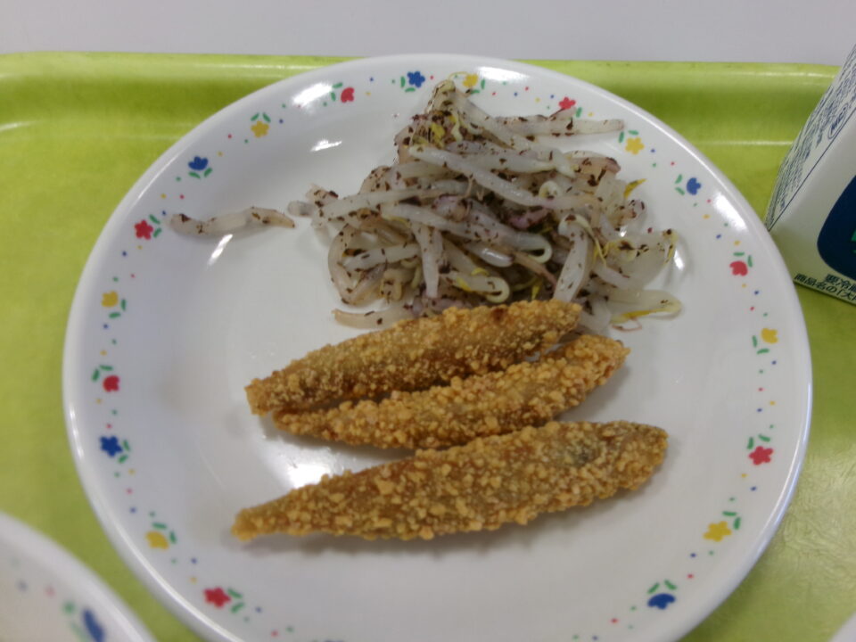今日の給食は、ご飯、牛乳、きびなごのかりかりフライ、もやしのしそ和え、じゃがいものうま煮でした。