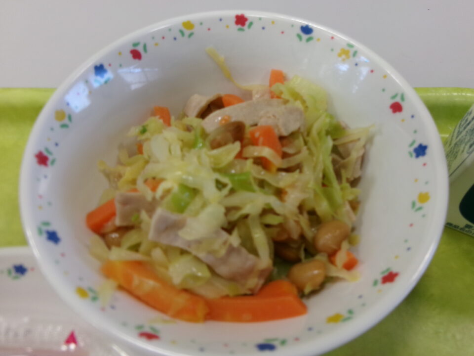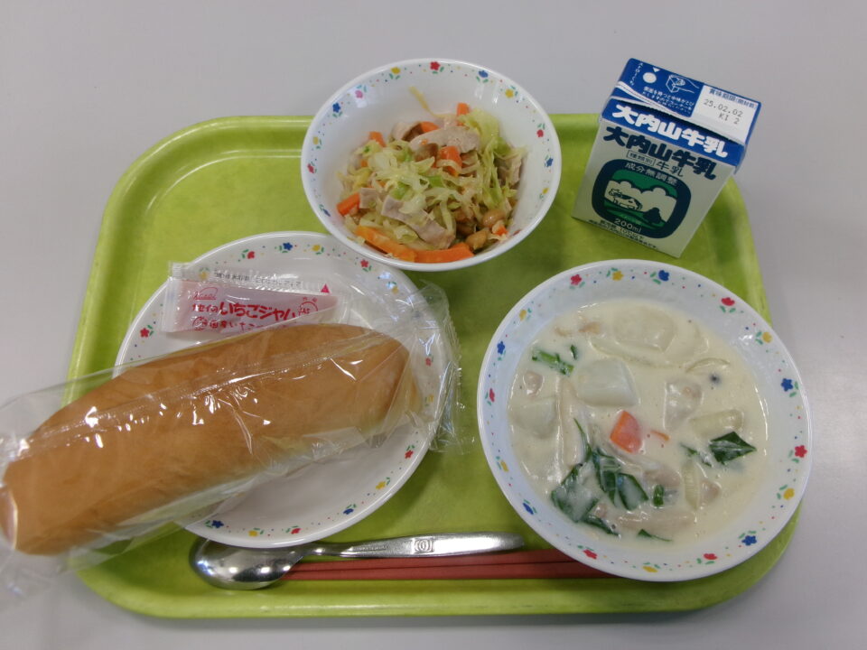 今日の給食は、コッペパン、牛乳、かぶとしめじのクリーム煮、大豆入りサラダ、いちごジャムでした。