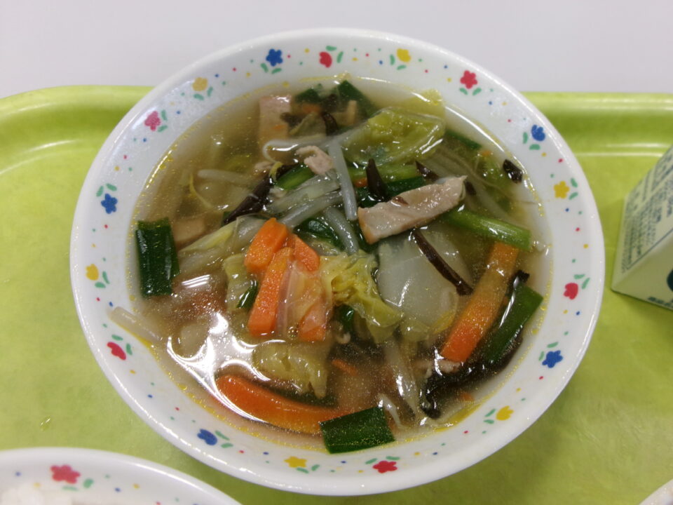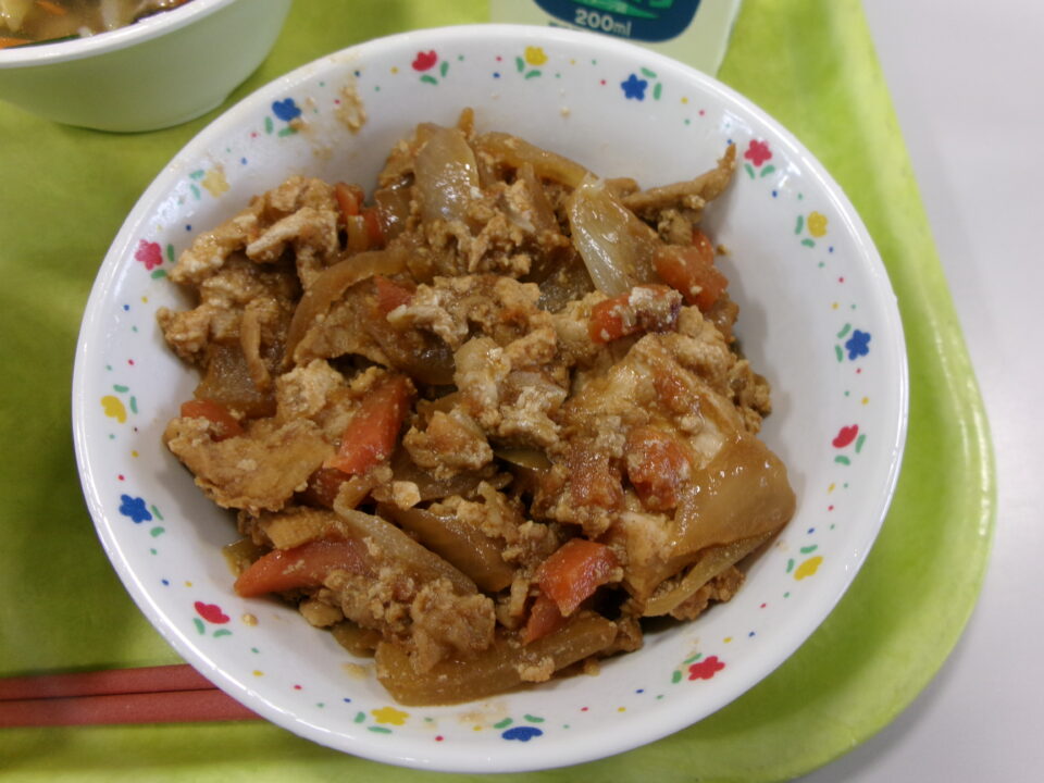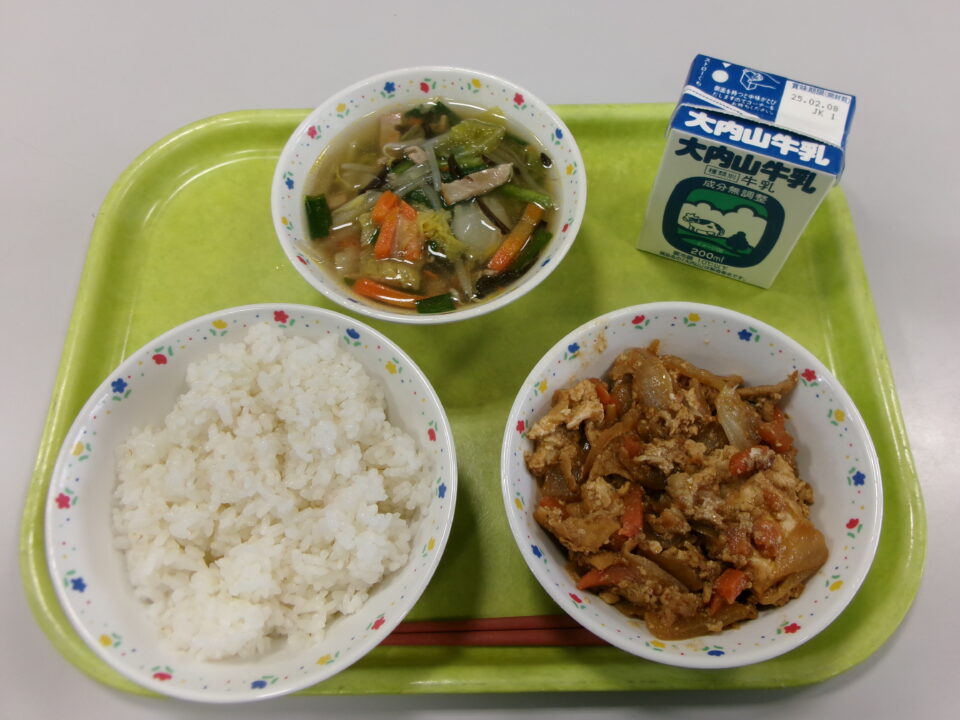 今日の給食は、ご飯(麦入り)、牛乳、豚肉と厚揚げのみそ炒め、飯高産きくらげのスープでした。