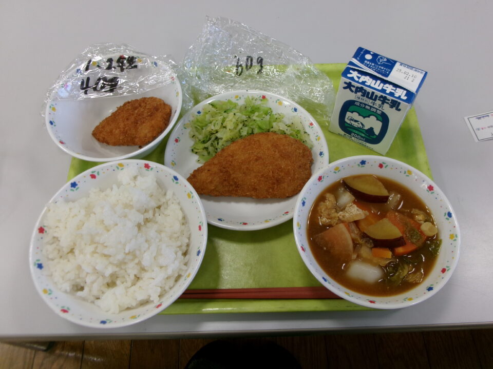 今日の給食は、ご飯、牛乳、かつおフライ、キャベツの青じそ和え、まごころぽかぽか汁でした。