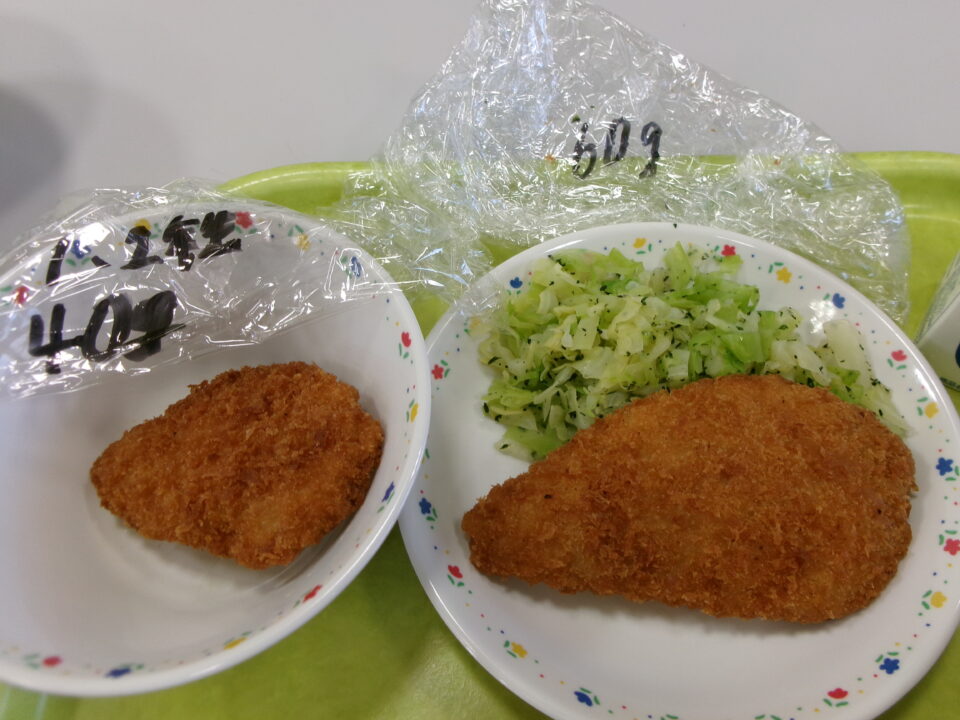 今日のかつおフライも1,2年生は40g、3年生以上は60gと発達年齢に合わせて大きさを変えてあります。