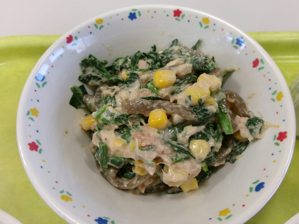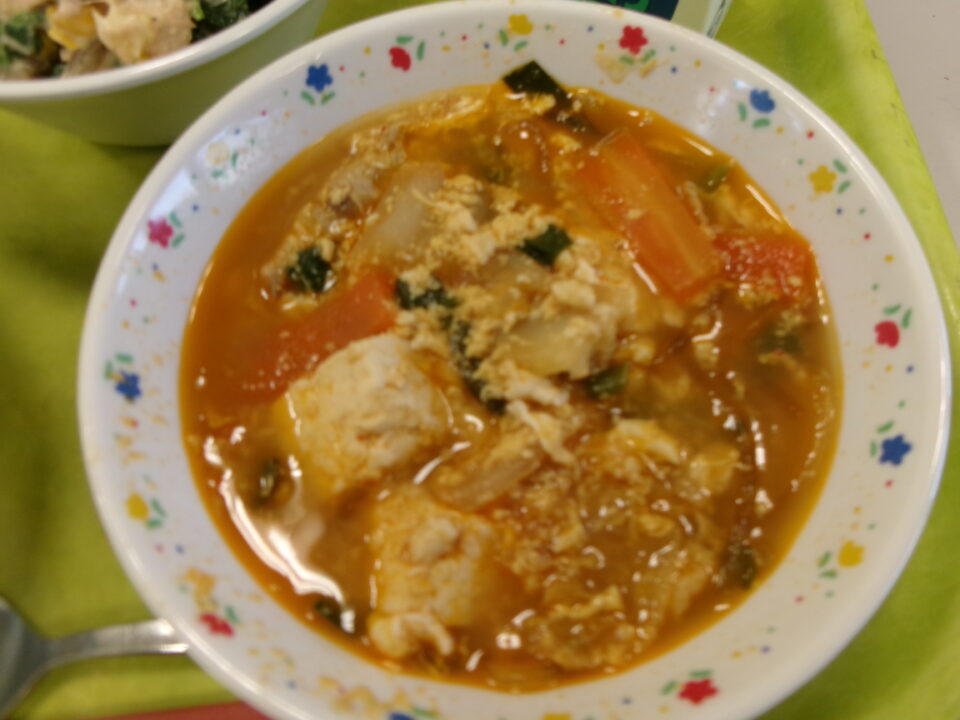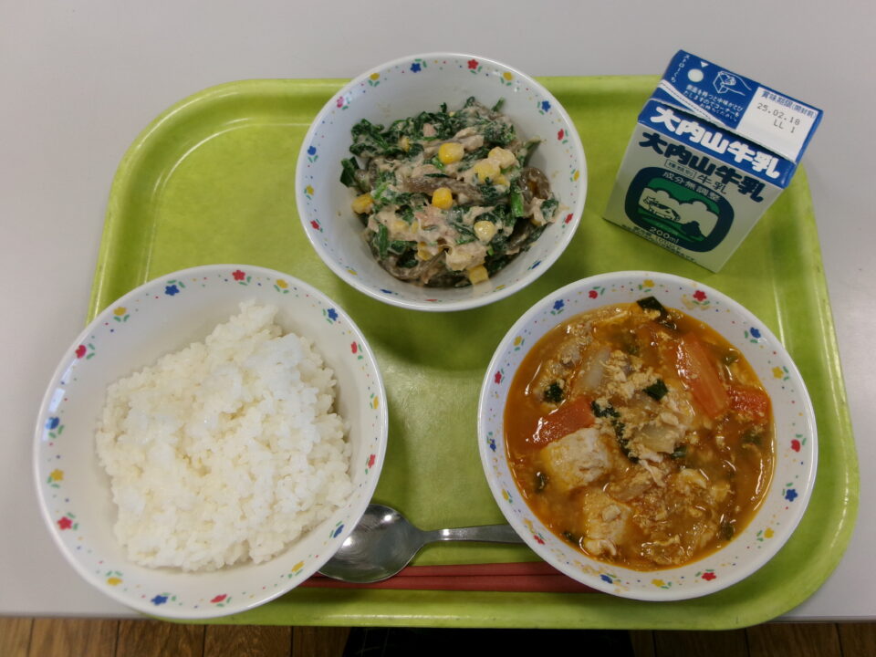 今日の給食は、ご飯、牛乳、卵と豆腐のチゲ風、つきこんにゃくサラダでした。